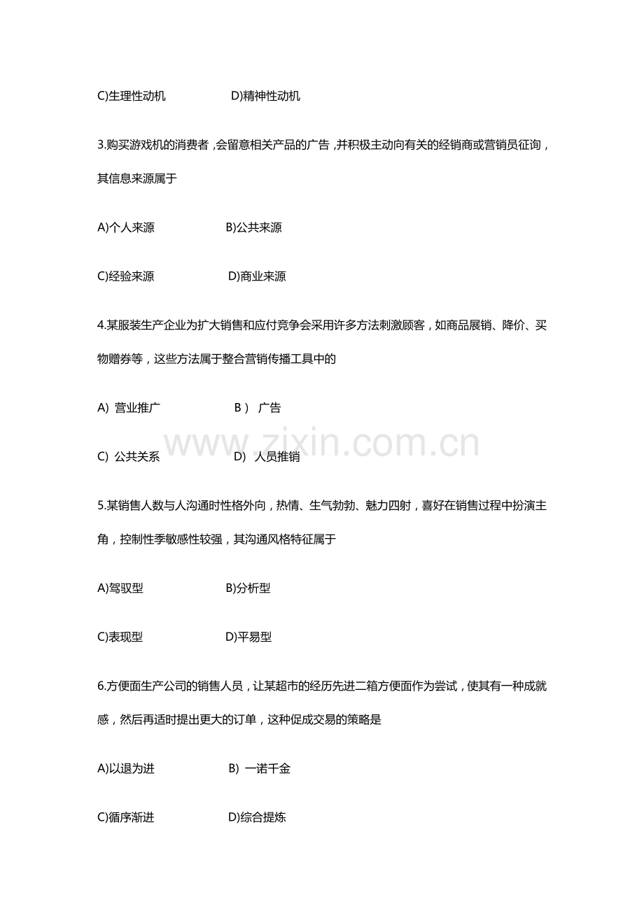 6.方便面生产公司的销售人员,让某超市的经历先进二箱方便面作为尝试,使其有一种成就感,然后再适时提出更大的订单,这种促成交易的策略是
