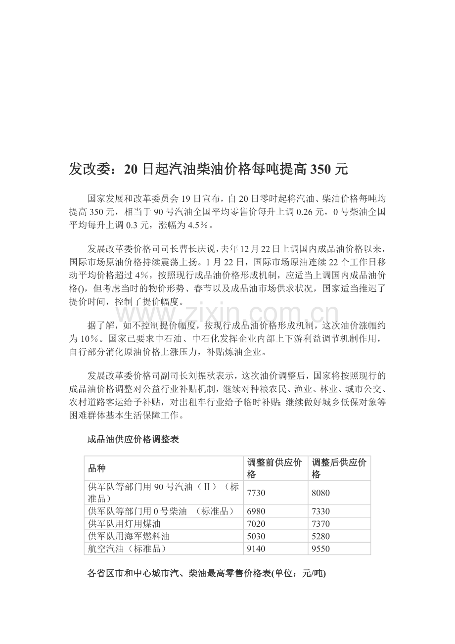 国家发展和改革委员会19日宣布,自20日零时起将汽油、柴油价格每吨均提高350元,相当于90号汽油全国平均零售价每升上调0.26元,0号柴油全国平均每升上调0.3元,涨幅为4.5%。