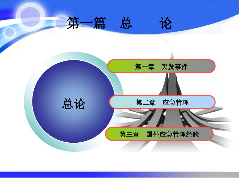 单击此处编辑母版标题样式,单击此处编辑母版文本样式,第二级,第三级,第四级,第五级,第一篇总论,第一章突发事件,第二章应急管理,第三章国外应急管理经验,总论,第一章突发事件,1.,理解突发事件的内涵、外延及特征。,2.,理解突发事件与风险、危机、紧急状态、灾害等相关概念的联系与区别。,学习目标,学习重点,掌握突发事件的分类、分级与分期理论。,第一章突发事件,第一节突发事件的基本定义,第二节突发事件的分类,突发事件,第三节突发事件的分级,第四节突发事件的分期,第一节,突发事件的基本定义,“突然发生,造成或者可能造成严重社会危害,需要采取应急处置措施予以应对的自然灾害、事故灾难、公共卫生事件和社会安全事件。”,突发事件的特征,(,1,)突发性和紧急性。,(,2,),严重性。,(,3,)不确定性。,(,4,)社会性。,(,5,)同时涉及程序化与非程序化决策。,第一节,突发事件与相关概念的联系与区别,(,一)“突发事件”,VS,“紧急状态”,(,二)突发事件与,VS,“风险”、“危险”,(,三)“突发事件”,VS,“危机”,(,四)“突发事件”,VS,“公共安全”,(,五)“突发事件”,VS,“灾害”、“灾难”,第二节,突发事件的分类,基于事件发生的诱因进行分类:,第二节,突发事件的分类,目前学术界和实务部门争论的焦点集中在是将经济安全事件单独列为一种特定类型,还是将它纳入社会安全事件中加以管理。,第三节,突发事件的分级,突发事件分级的影响要素:,第三节,突发事件的分级,中国对突发事件的分级:,中华人民共和国突发事件应对法,第三节,突发事件的分级处置,突发事件的应急处置要遵循“统一领导、综合协调、分类管理、分级负责、属地管理为主”的原则。,第三节,突发事件的分级处置,第四节,突发事件的分期,第四节,突发事件的分期,延 伸 阅 读,第二章应急管理,1.,了解国际应急管理的发展阶段及其特点。,2.,了解民防在应急管理发展进程中的作用。,3.,了解应急管理、风险管理、危机管理的基本内容。,学习目标,学习重点,理解应急管理的内涵与特点,辨析其与风险管理、危机管理的联系与区别。,第二章应急管理,第一节应急管理的发展阶段,第二节应急管理的内涵与外延,应急管理,第三节应急管理与风险管理、危机管理,第一节,应急管理的发展阶段,第一节,应急管理的发展阶段,阶段,时间,特点,主要国,家示例,前应急管理时期,20,世纪,50,年代以前,一事一管、一事一议,美国、新西兰、日本,应急管理规范期,20,世纪,5090,年代,综合应急管(,CEM,)体系的建设,其基础是“命令与控制”理论,即通过整合式应急管理系统(,IEMS,)的发展实现运转。,新西兰、美国,第一节,应急管理的发展阶段,阶段,时间,特点,主要变化,应急管理拓展期,21,世纪以来,(,1,)由单项减灾向综合减灾转变,由单一事件处置向多种事件综合管理转变,从单纯的自然灾害处置向各类突发事件管理延伸;(,2,)由减轻灾害向减轻灾害风险、加强风险管理转变,从重在处置向“预防为主”转变;(,3,)由单纯减灾向减灾与可持续发展相结合转变;(,4,)从单纯应对一个方面、一个区域的突发事件向更多领域、更大区域扩展,由一个国家减灾向全球或区域联合减灾转变。,(一)突发事件应对主体的变化;,(二)应急管理工作制度的变化;,(三)应急管理法律依据的变化。,第二节,应急管理的内涵与外延,应急管理的 内 涵,管理主体:党委领导、政府负责、社会协同、公众参与,。,管理客体:应急管理强调对突发事件的综合管理。,应急管理是针对各类突发事件(包括自然灾害、事故灾难、公共卫生事件和社会安全事件),从预防与应急准备、监测与预警、应急处置与救援到事后恢复与重建等全方位、全过程的管理。,第二节,应急管理的内涵与外延,应急管理重在思想而不单是手段,应急管理的外延,预防为主,预防与应急相结合,第二节,应急管理的内涵与外延,应急管理研究视角,国际关系与国际政治学视角,公共关系与传播学视角,心理学,视角,社会学,视角,政治学,视角,信息管理学视角,法律视角,自然科学视角,第三节,应急管理与风险管理、危机管理,第三节,应急管理与风险管理、危机管理,应急管理,事前、事发、事中、事后的全过程管理,风险管理,应急管理工作的“关口再前移”,危机管理,“做最坏的打算”,强调决策的非常规性和“艺术性”,延 伸 阅 读,第三章国外应急管理经验,1.,掌握国外政府应急管理的主要经验和方法。,2.,了解国外社会组织在应急管理发展进程中的作用。,3.,了解国际组织在应急管理中的功能。,学习目标,学习重点,学习国外应急管理的主要经验与方法。,第三章国外应急管理经验,第一节国外应急管理中的政府组织,第二节国外应急管理中的社会组织网络,应急管理,第三节应急管理的国际组织,第一节,国外应急管理中的政府组织,应急管理政府组织包括参与应急管理的各级政府及其部门和机构,是应急管理的权力部门,也是主要的管理实施部门。,各国政府在建立和完善应急管理机构时,面临的问题就是如何定位应急管理机构的工作职能,综合其经验,推动应急管理机构“使能性”(,enabling,)角色的发展,(,如表,3.1,)。,应急管理“使能性”机构的建设情况,政府组织的基本情况,国外应急管理政府组织的建设情况,第一节,国外应急管理中的政府组织,第一节,国外应急管理中的政府组织,第一节,国外应急管