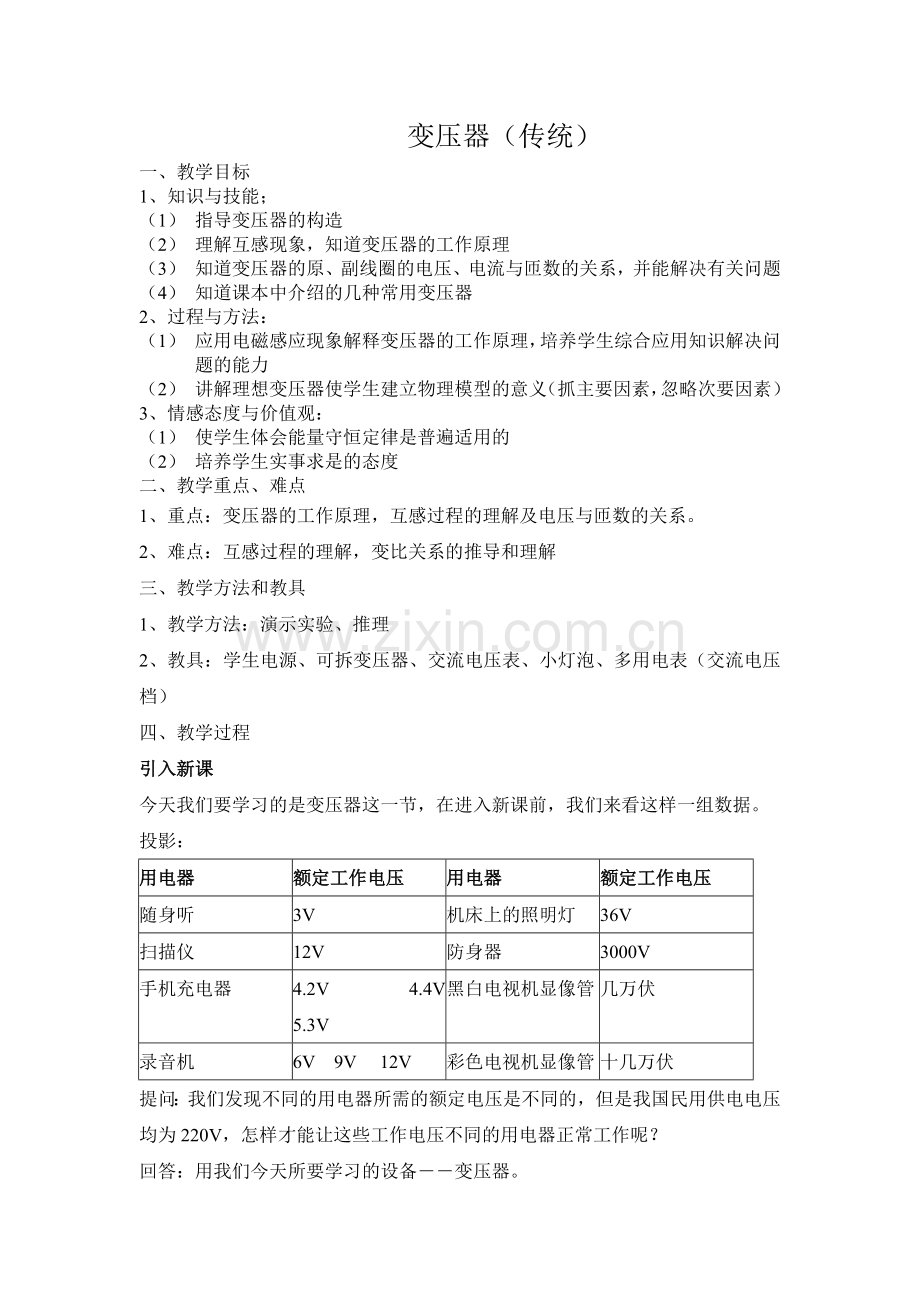 2、教具:学生电源、可拆变压器、交流电压表、小灯泡、多用电表(交流电压档)