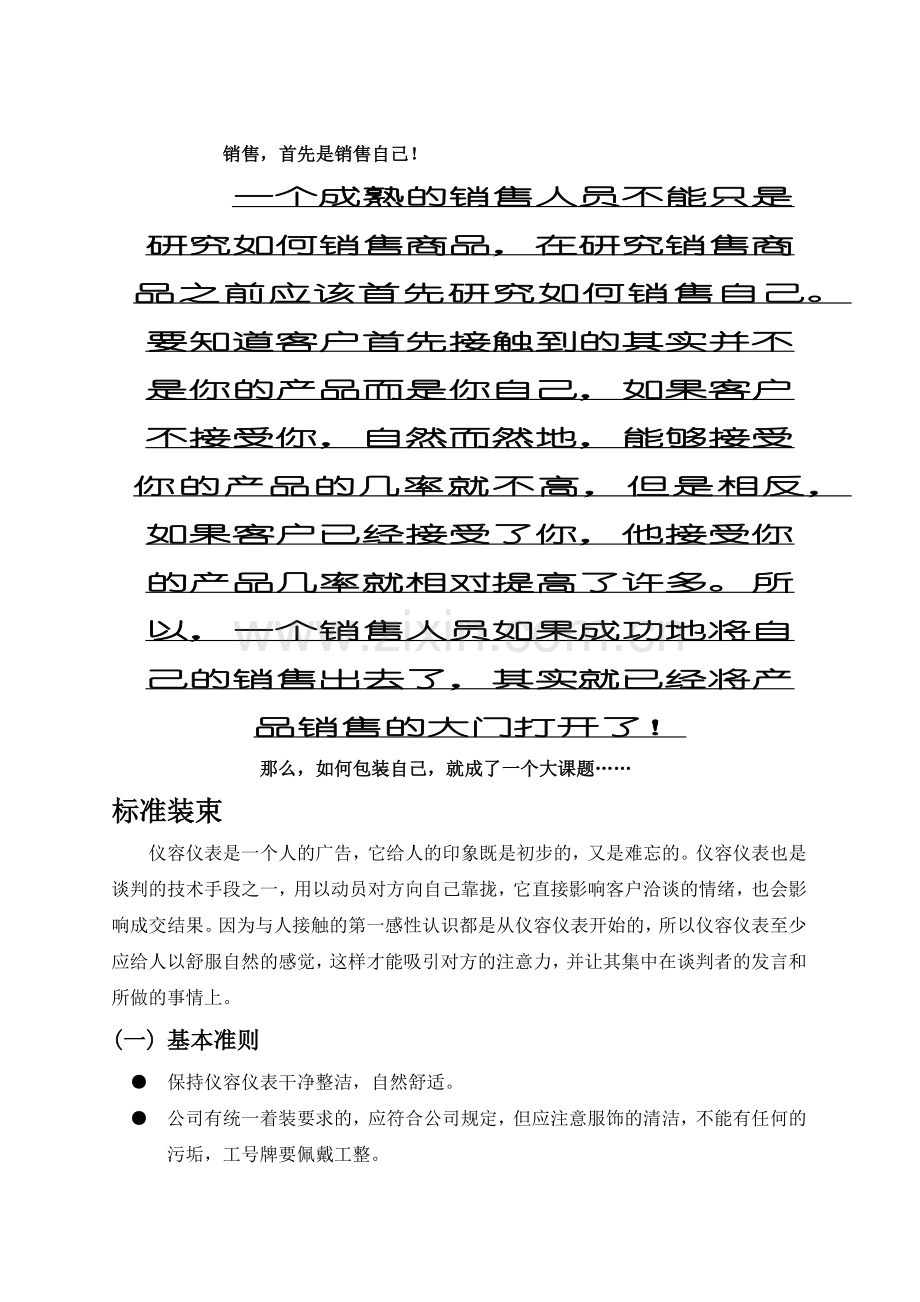 大家都看到过军人的站姿,没有谁不为他们的挺拔优雅的站姿所动。当然,我们销售人员没有受过专门的训练,无法也没有必要完全做到他们站立时的姿态,因为那种站岗式的笔直挺拔会让客户觉得很拘谨,我们需要的是站立时能表现出一种青松的气宇,让人觉得你自然、有精神。