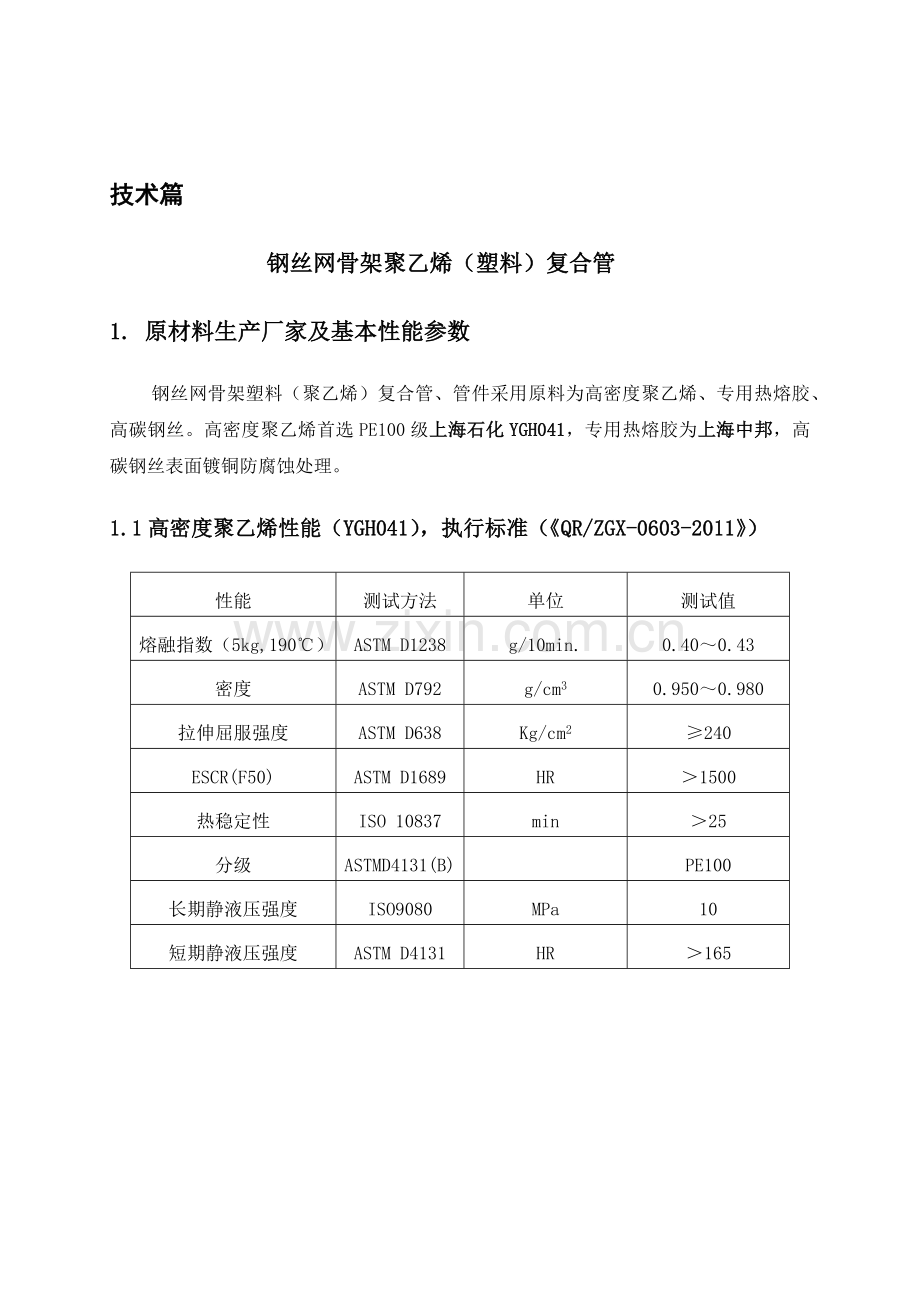 钢丝网骨架塑料(聚乙烯)复合管、管件采用原料为高密度聚乙烯、专用热熔胶、高碳钢丝。高密度聚乙烯首选PE100级上海石化YGH041,专用热熔胶为上海中邦,高碳钢丝表面镀铜防腐蚀处理。