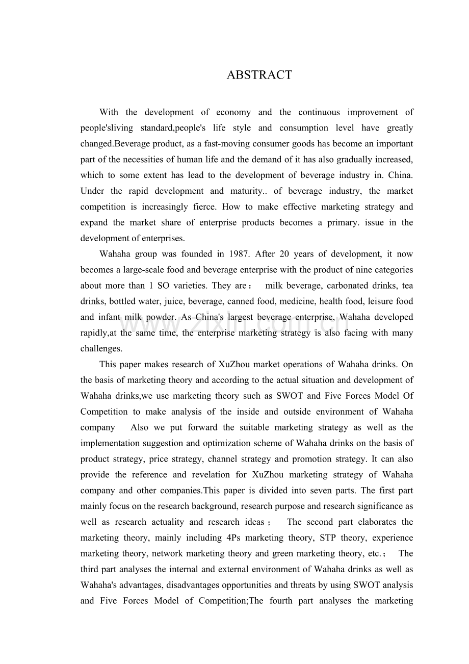 Wahaha group was founded in 1987. After 20 years of development, it now becomes a large-scale food and beverage enterprise with the product of nine categories about more than 1 SO varieties. They are: milk beverage, carbonated drinks, tea drinks, bottled water, juice, beverage, canned food, medicine, health food, leisure food and infant milk powder. As China's largest beverage enterprise, Wahaha developed rapidly,at the same time, the enterprise marketing strategy is also facing with many challenges.