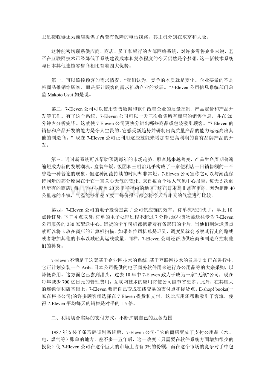 7-Eleven不满足于这套基于企业网技术的系统,基于互联网技术的发展计划已在进行中,它正计划安装一个Ariba日本公司提供的电子商务软件用来进行办公用品等的大宗采购,以降低费用。这方面它已尝到甜头,过去10年中7-Eleven致力于成为一家“无纸”公司,现在每年减少700亿日元的管理费用,互联网技术的应用将使公司能节省更多。此外,在其庞大的连锁便利店基础上,7-Eleven要把自己变成在线交易的支付点和提货点。E-shop! books(一家在售书公司)的许多顾客就选择在7-Eleven提货和支付。这此应用还帮助吸引了客流,使得7-Eleven平均每天的销售是对手的1.5倍。