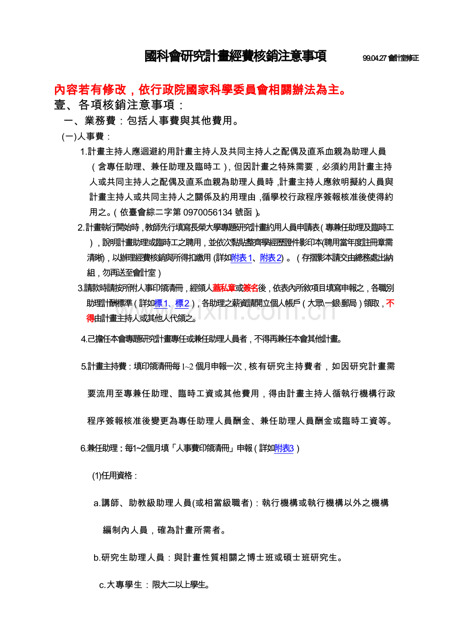 2.行政院國家科學委員會補助專題研究計畫助理人員約用注意事項