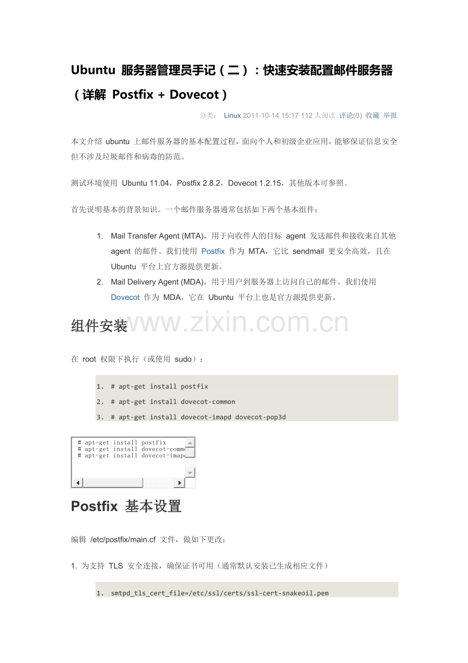 1. Mail Transfer Agent (MTA),用于向收件人的目标 agent 发送邮件和接收来自其他 agent 的邮件。我们使用 Postfix 作为 MTA,它比 sendmail 更安全高效,且在 Ubuntu 平台上官方源提供更新。