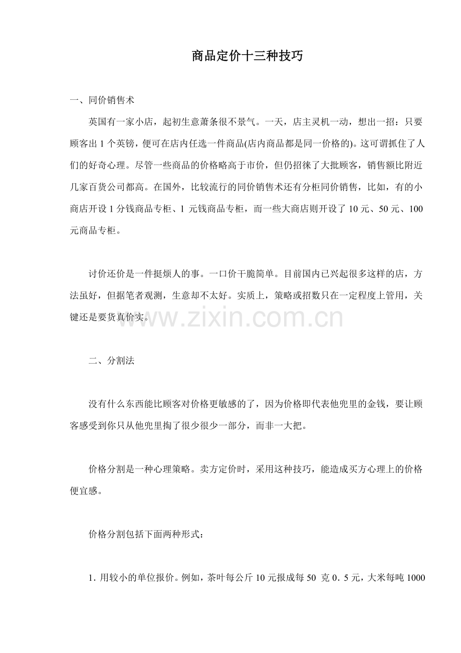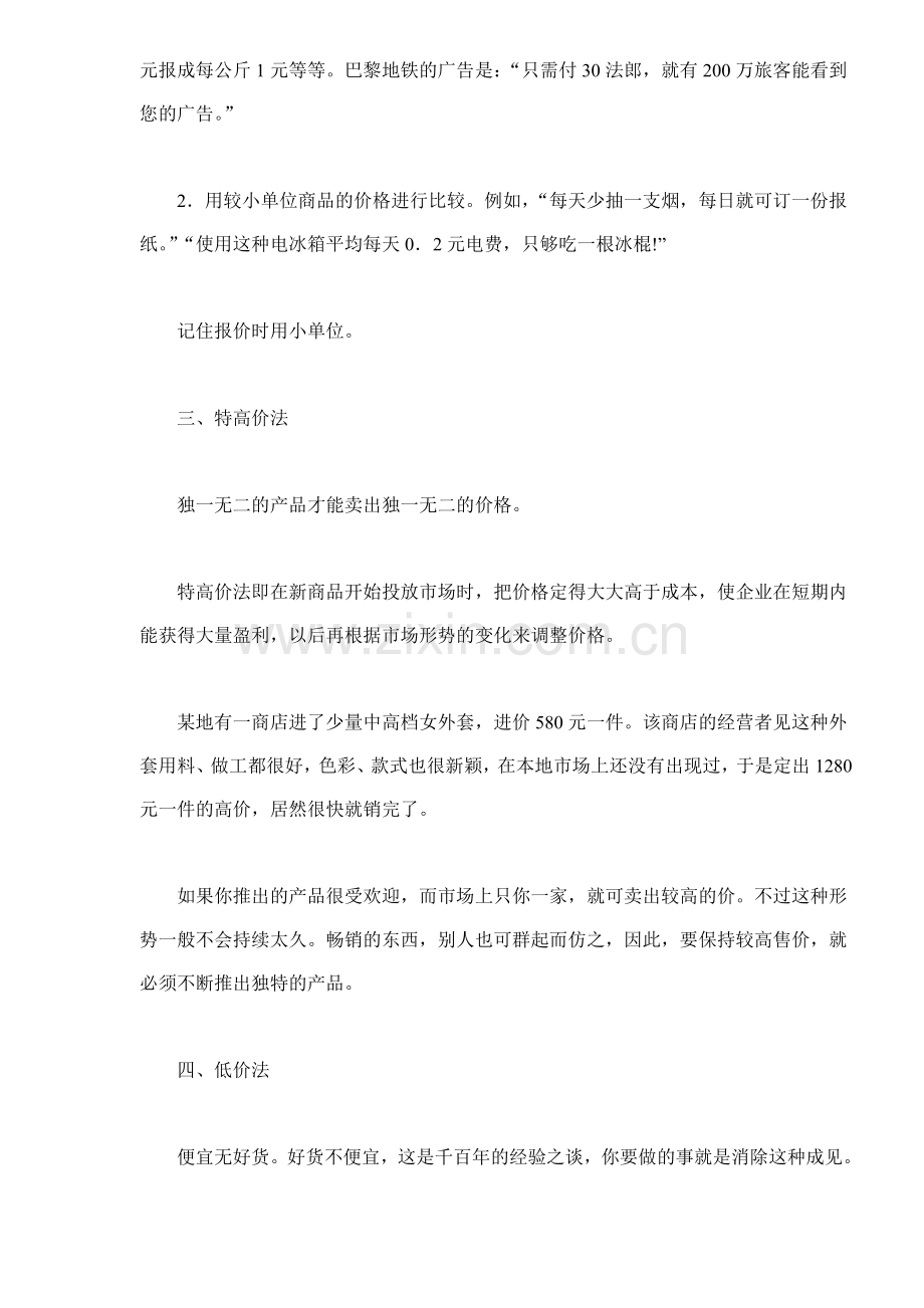 1.用较小的单位报价。例如,茶叶每公斤10元报成每50 克0.5元,大米每吨1000元报成每公斤1元等等。巴黎地铁的广告是:“只需付30法郎,就有200万旅客能看到您的广告。”