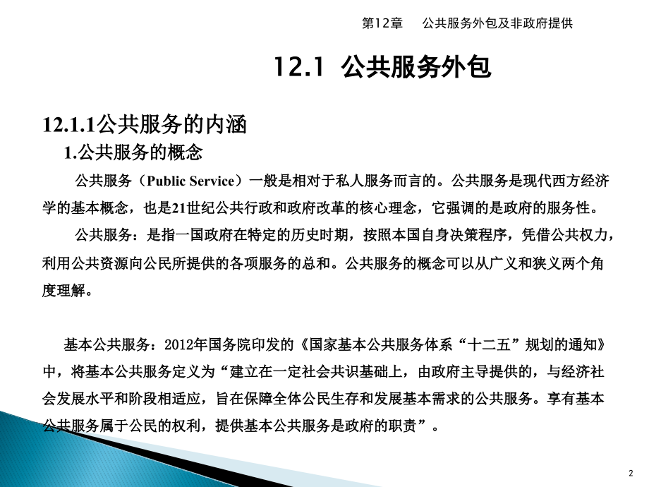 单击此处编辑母版标题样式,单击此处编辑母版文本样式,第二级,第三级,第四级,第五级,2016/12/7,#,单击此处编辑母版标题样式,单击此处编辑母版文本样式,第二级,第三级,第四级,第五级,2016/12/7,#,12.1,公共,服务,外包,12.2,私营企业,参与公共服务,外包,12.3,非营利组织,参与公共服务,外包,12.4,公共,服务外包的国内外,实践,第,12,章,公共服务外包及非政府提供,1,请播放视频,政府购买服务不是甩包袱,12.1.1,公共,服务的,内涵,1.,公共,服务的,概念,公共,服务(,Public Service,)一般是相对于私人服务而言的。公共服务是现代西方经济学的基本概念,也是,21,世纪公共行政和政府改革的核心理念,它强调的是政府的服务性,。,公共服务:是,指一国政府在特定的历史时期,按照本国自身决策程序,凭借公共权力,利用公共资源向公民所提供的各项服务的总和,。公共,服务的概念可以从广义和狭义两个角度理解,。,基本公共服务:,2012,年国务院印发的,国家基本公共服务体系“十二五”规划的通知,中,将基本公共服务定义为“建立在一定社会共识基础上,由政府主导提供的,与经济社会发展水平和阶段相适应,旨在保障全体公民生存和发展基本需求的公共服务。享有基本公共服务属于公民的权利,提供基本公共服务是政府的职责”。,第,12,章,公共服务外包及非政府提供,12.1,公共,服务外包,2,3,2.,公共服务的分类,(,1,)按照公共服务的属性特征,纯公共服务,准公共服务,(,2,)按照公共服务的功能分类,公共安全性服务,基础性服务,经济性公共服务,社会性公共服务,(,3,)按照公共服务的需求层次分类,保障性公共服务,发展性公共服务,(,4,)按照公共服务的受益空间分类,全国性的公共服务,地方性的公共服务,外溢性的公共服务,3.,公共服务的特征,(,1,)公共性,公共,服务是政府的基本职能之一,是政府凭借公共权力,利用公共资源,,为满足公共利益,实现公共目标,向社会公众提供的服务。公共性是公共服务的内在要求。,(,2,)公平性,公共服务的公平性是指公共服务的提供不能坚持唯效率至上的原则,应该体现效率与公平的统一,且将公平原则作为首要原则。政府应该确保所有公民都能公平的享用大致均等的公共服务。,第,12,章,公共服务外包及非政府提供,4,(,3,)均等性,均等性,是政府基本公共服务其他基本属性和特征的可操作性化、可考量的指标,为实现政府基本公共服务公平性、民主性、统一性、普遍性提供了一个现实的实现途径。均等性的核心是机会的均等,而不是简单的平均化和无差异化,。,(,4,)民主性,保证,政府公共服务的公共性和公平性,需要公众的有效监督,而这种,监督本身反映了公共服务民主性的要求。,(,5,)普遍性,与市场相比,政府的资源配置是为整个社会和全体社会成员服务,服务的对象是公民及其组织包括经济组织和社会组织,具有普遍性、强制性。,第,12,章,公共服务外包及非政府提供,5,12.1.2,公共,服务外包,概述,1.,公共,服务外包的,兴起,二战,以后,西方国家政府规模膨胀和经济滞涨带来了日益加剧的财政赤字,加之过度的官僚主义导致的管理失调、效率低下严重影响到政府公共服务的有效供给。,20,世纪,80,年代,新公共管理运动随即兴起,全世界范围内掀起了汹涌澎湃的政府改革浪潮。这次改革的趋势就是将市场机制引入到公共部门,即公共服务的市场化与民营化,。,公共服务外包作为公共服务市场化、民营化的主要形式最早是由工党执政的新西兰发起。随后英国撒切尔政府和美国里根政府致力于推动新公共管理运动,改革政府公共服务领域的职能,大力推行公共服务外包。,第,12,章,公共服务外包及非政府提供,6,2.,公共,服务外包的概念及,范围,(,1,)公共,服务外包,的概念,公共,服务外包(,Public Service Outsourcing,)是指政府将其承担的公共服务职能,采取市场竞争的方式,以合同为载体,转移给政府以外的私营企业、非盈利组织、或个人实施,政府对服务结果进行评估,并向承包商支付费用,。,公共,服务外包实际上是政府与私营企业、非营利组织和个人在公共服务的生产及提供上的分工合作与安排。在这些安排中,私营企业和非营利组织是生产者,政府是安排者,。,第,12,章,公共服务外包及非政府提供,7,8,(,2,)公共服务外包的范围,关于公共服务外包的范围问题,学术界的观点不尽相同。,梅塞,(Mercer),认为,地方政府所提供的每一项服务或所履行的每一项职能都能被承包出去。,波斯顿(,Boston,)从政府职能范围考虑认为,为了公众利益,传统的政府职能不能外包,这些职能有:政策制定和建议、规划、规制、法律强制执行应急服务等。,多,纳修(,Donahue,)则从动机的角度加以分析,即私人承包商是以利润最大化为目的的,而公务员则被认为是对公共服务具有责任心,更能维护公共利益,。,哈,特(,Oliver Hart,)从经济学角度分析认为,那些具有质量难以度量特征,即质量不可收缩性,(non-contractible quality),的服务,由公共部门承担则会更好,虽然这样可能意味着高成本和平庸的质量,。,布朗,(Brown),与博多斯基,(Potoski),认为,交易成本的高低则是公共服务外包决策的重要依据。低交易成本的服务最适宜外包,高交易成本的服务适合内部生产,混合交易成本的服务应视情况而定,。,总之,仅从服务本身去思考公共服务外包的范围问题可能过于局限,制度环境、信任、组织的多元功能等等因素必须加入分析框架之中。,第