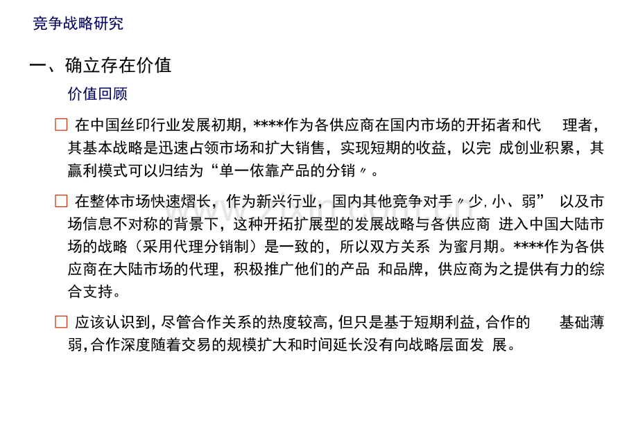 □ 在整体市场快速熠长,作为新兴行业,国内其他竞争对手〃少,小、弱” 以及市场信息不对称的背景下,这种开拓扩展型的发展战略与各供应商 进入中国大陆市场的战略(采用代理分销制)是一致的,所以双方关系 为蜜月期。****作为各供应商在大陆市场的代理,积极推广他们的产品 和品牌,供应商为之提供有力的综合支持。