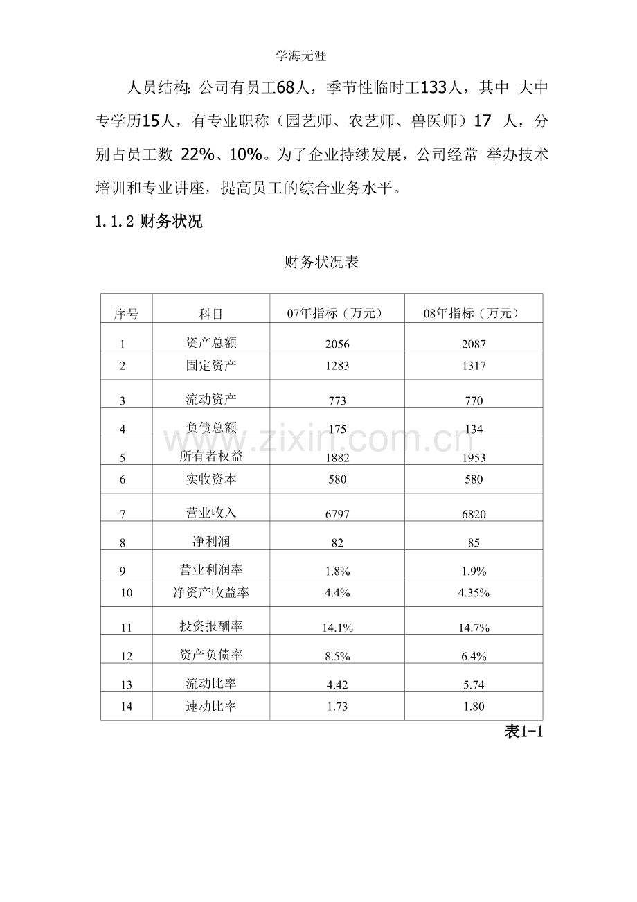 人员结构:公司有员工68人,季节性临时工133人,其中 大中专学历15人,有专业职称(园艺师、农艺师、兽医师)17 人,分别占员工数 22%、10%。为了企业持续发展,公司经常 举办技术培训和专业讲座,提高员工的综合业务水平。