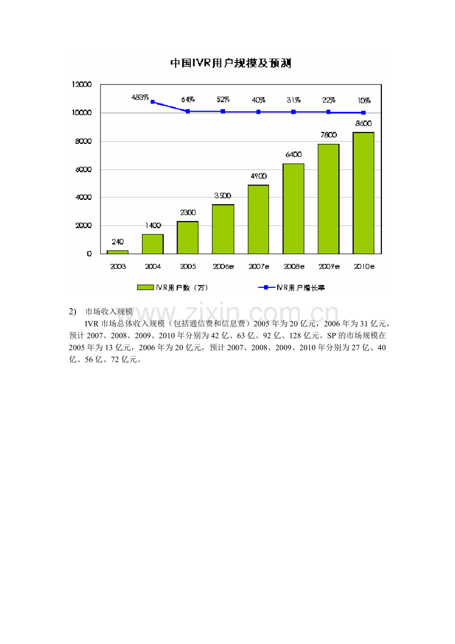 2003年只有240万,2004年用户数增长了近6倍,达到1400万户,04年是IVR业务迅速膨胀的一年,2005年用户规模达到2300万户,增长率达64%,预计2010年用户数将接近9000万,2006~2010年复合增长率为30.2%。