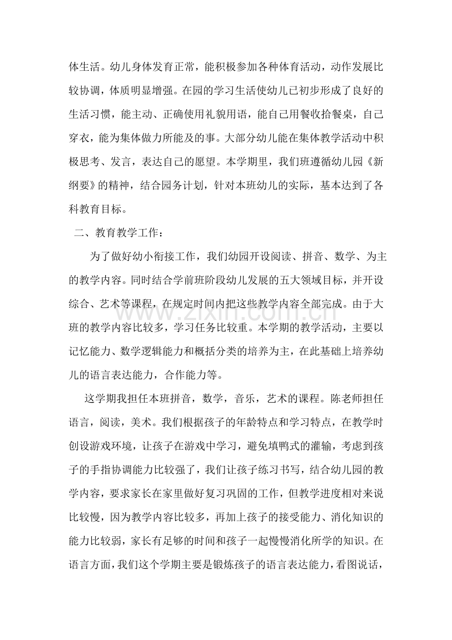 首先,对各位家长朋友的到来表示热烈的欢迎,并感谢你们能从百忙之中抽空来参加这次家长会,让我感受到了各位对我们幼儿园工作的理解和支持,对孩子学习情况的一种关心,正是有了你们的信任、理解、支持,我们的工作才能顺利开展。在此我真诚的对你们说声谢谢,感谢你们的热情支持。同时,更希望你们能一如既往的关心与支持我们的工作。大班是孩子们在幼儿园生活的最重要的一年,也是孩子们入学前十分重要和关键的一年。作为教师,我们将更加耐心,仔细,认真,尽自己最大的努力去培养孩子各方面的能力;孩子经过几个月的学习与生活,在各方面都有进步。在教师的眼里,每个孩子的进步是针对孩子的本身表现所呈现出来的,如:有些孩子刚来我班,开始不爱说话,但是都现在期末已经能大胆的举手发言;如:有些孩子开学时才掌握5以内的加减,虽然现在也只掌握到8的加减,不像别的孩子掌握到20内的加减,但是对于这一个孩子来说,他进步了,在这里也希望家长善于发现自己孩子的进步,不要盲目的把自己的孩子去跟别的孩子攀比,而我今天在这里总结的也是集体的情况,可能没有具体到个人,也恳请家长给予理解。下面我把本学期来孩子在园的学习生活情况向各位家长汇报一下: