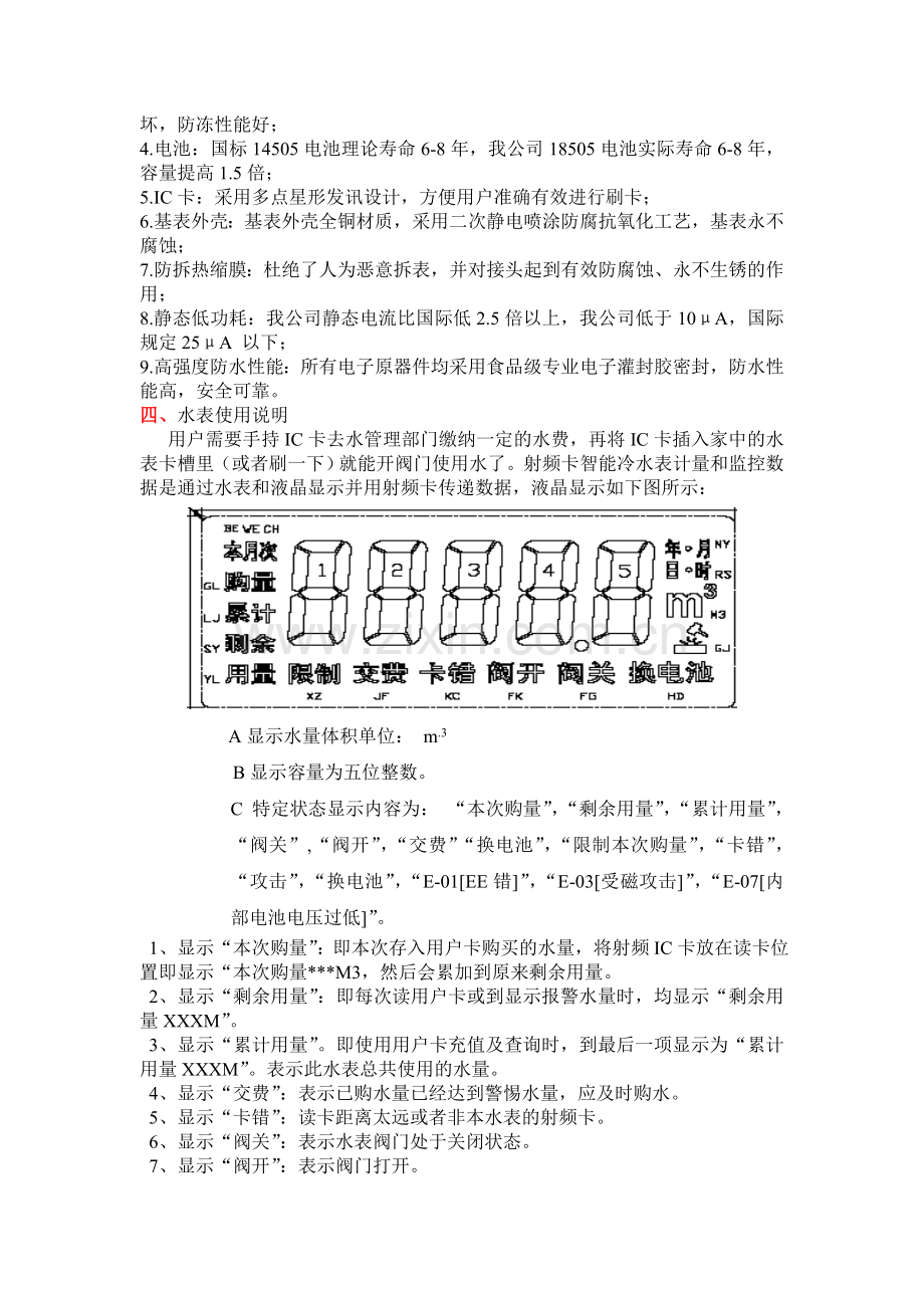 C 特定状态显示内容为: “本次购量”,“剩余用量”,“累计用量”,“阀关”,“阀开”,“交费”“换电池”,“限制本次购量”,“卡错”,“攻击”,“换电池”,“E-01[EE错]”,“E-03[受磁攻击]”,“E-07[内部电池电压过低]”。