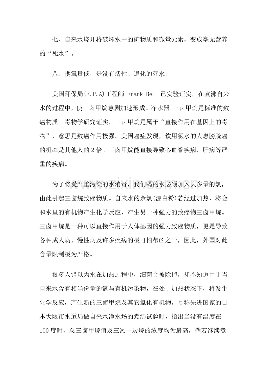 自来水中杀菌的余氯与水中的腐黑素反应生成三氯甲烷,是全球公认的第一号致癌物,自来水烧开后不但没有减少,恰恰相反,反而增加了3-4倍;