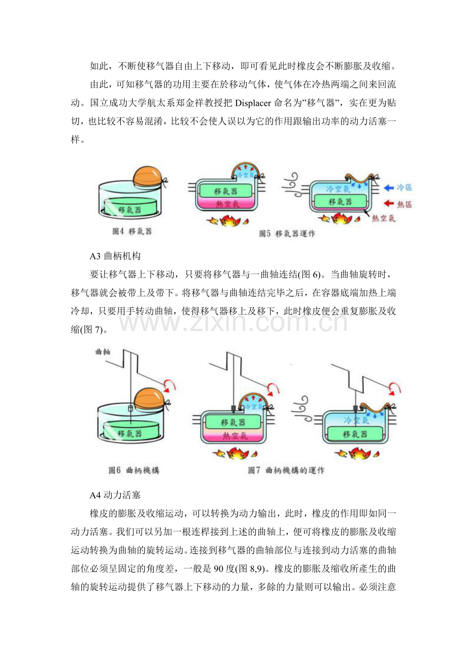 要让移气器上下移动,只要将移气器与一曲轴连结(图6)。当曲轴旋转时,移气器就会被带上及带下。将移气器与曲轴连结完毕之后,在容器底端加热上端冷却,只要用手转动曲轴,使得移气器移上及移下,此时橡皮便会重复膨胀及收缩(图7)。