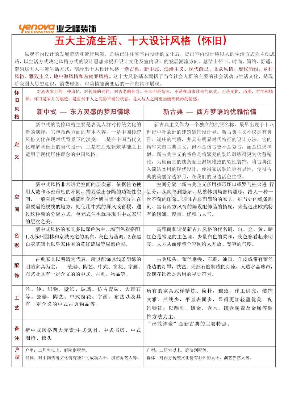 纵观室内设计的发展趋势和流行风潮,总结已往住宅室内设计的文化后,提出室内设计应以人的生活方式为主创思路,以生活方式决定风格方式的设计思想来提升设计文化及室内设计的发展潮流方向,总结出怀旧、时尚、简约、舒适、健康这五大主流生活方式,演绎出十大设计风格—新古典、新中式、浪漫主义、现代前卫、北欧风情、现代简约、乡村风格、雅致主义、地中海风情和东南亚风格。这十大风格基本囊括了当今社会人群的主要的社会活动与生活文化,是现阶段国人思想意识,消费理念、审美情趣演变后的一种归纳和展现。