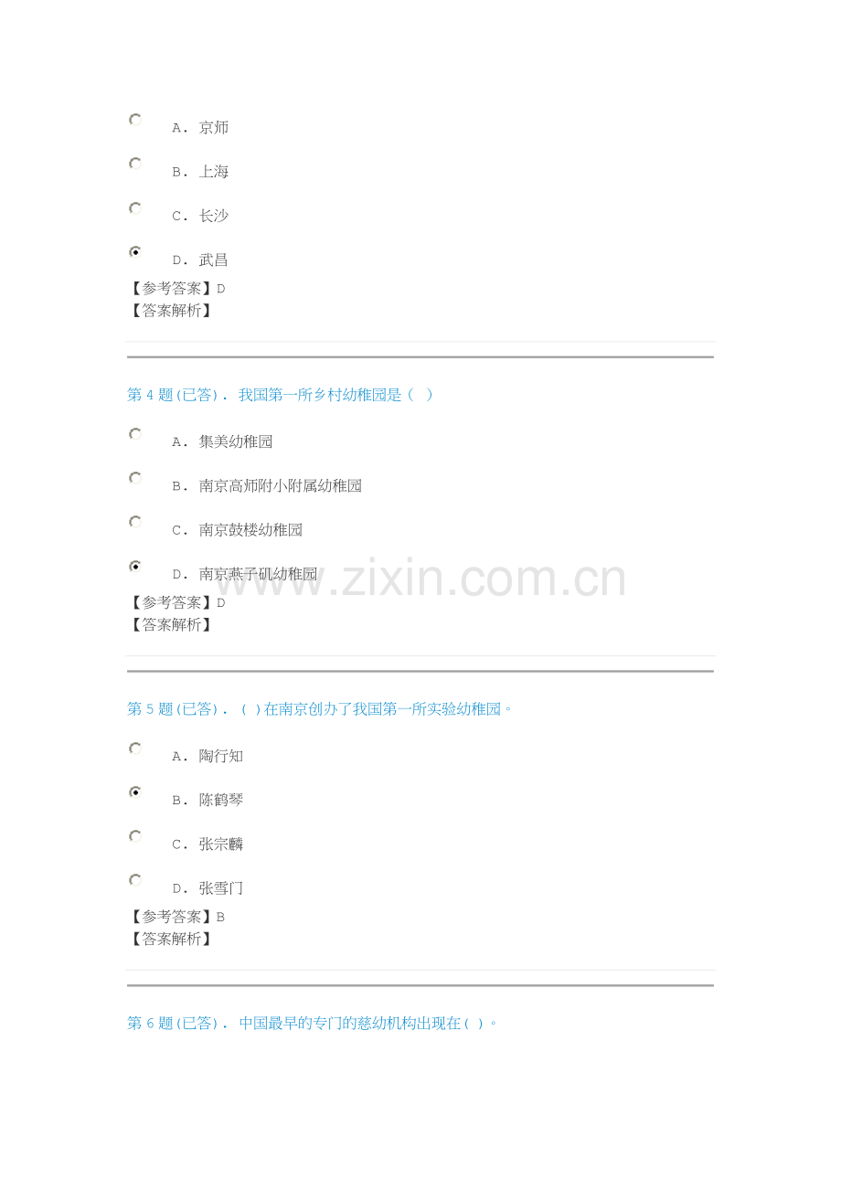 第5题(已答). ( )在南京创办了我国第一所实验幼稚园。