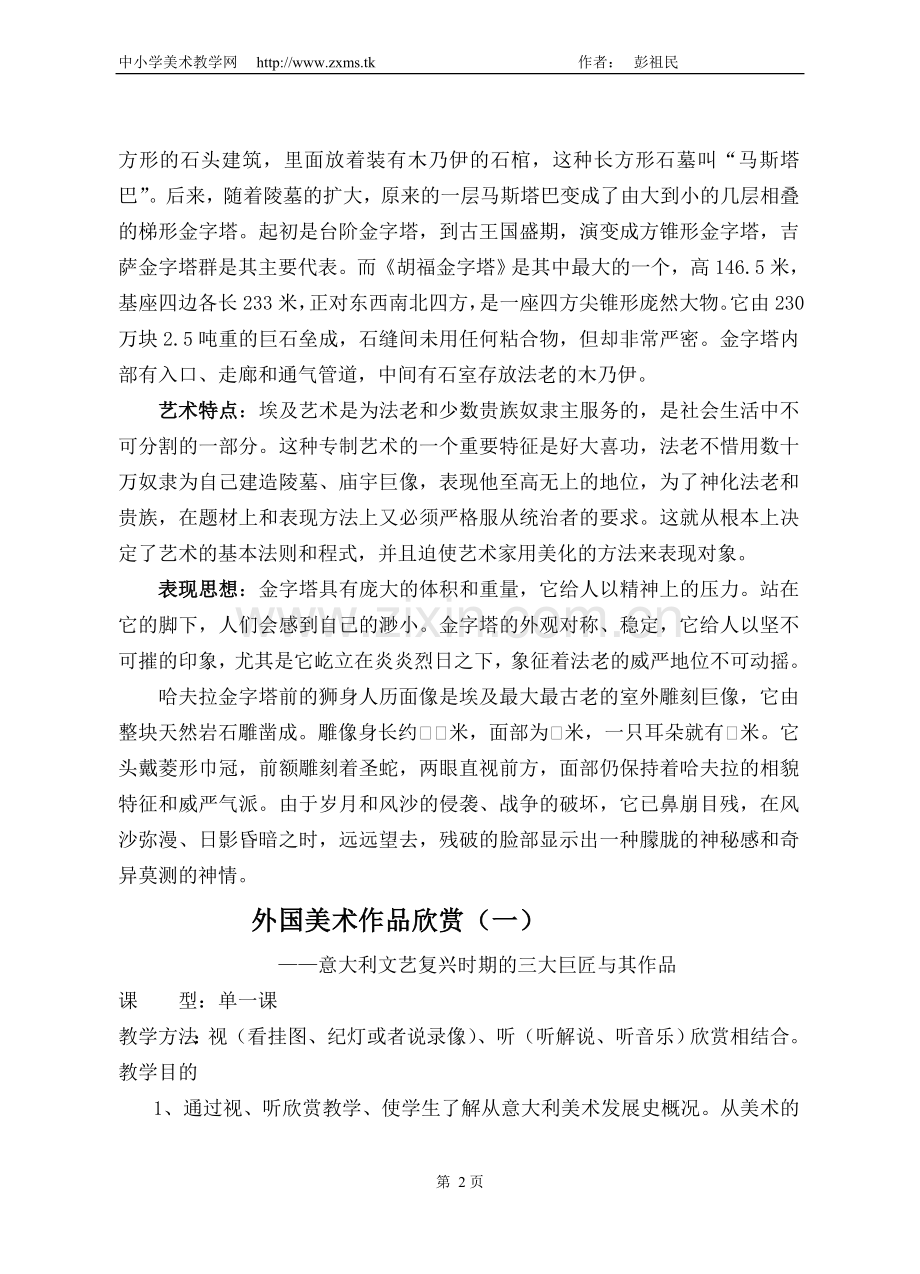 1、 通过视、听欣赏教学、使学生了解从意大利美术发展史概况。从美术的角度初步了解世界各国民族灿烂的古文化,培养学生对外国传统艺术的鉴赏力。