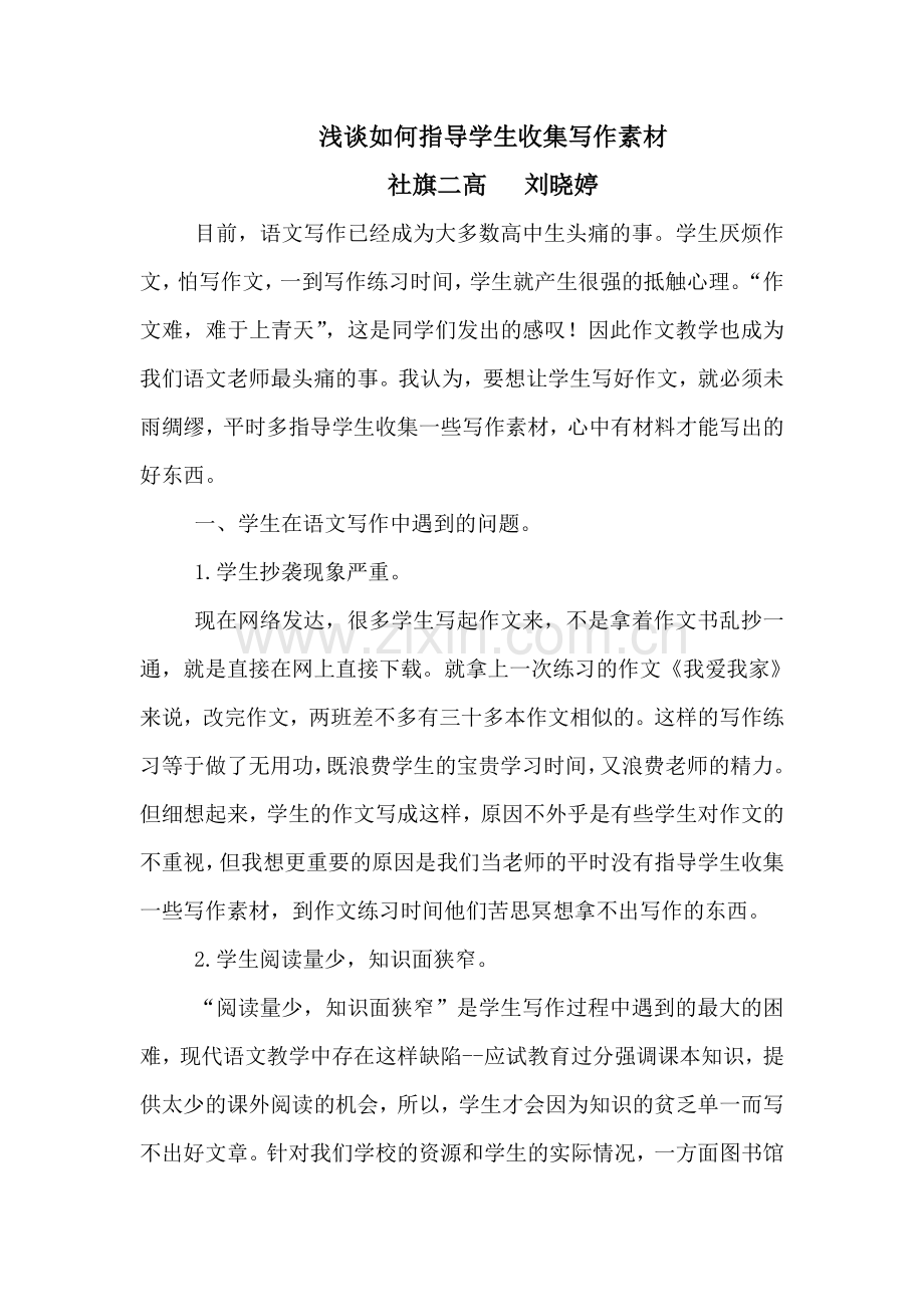 目前,语文写作已经成为大多数高中生头痛的事。学生厌烦作文,怕写作文,一到写作练习时间,学生就产生很强的抵触心理。“作文难,难于上青天”,这是同学们发出的感叹!因此作文教学也成为我们语文老师最头痛的事。我认为,要想让学生写好作文,就必须未雨绸缪,平时多指导学生收集一些写作素材,心中有材料才能写出的好东西。