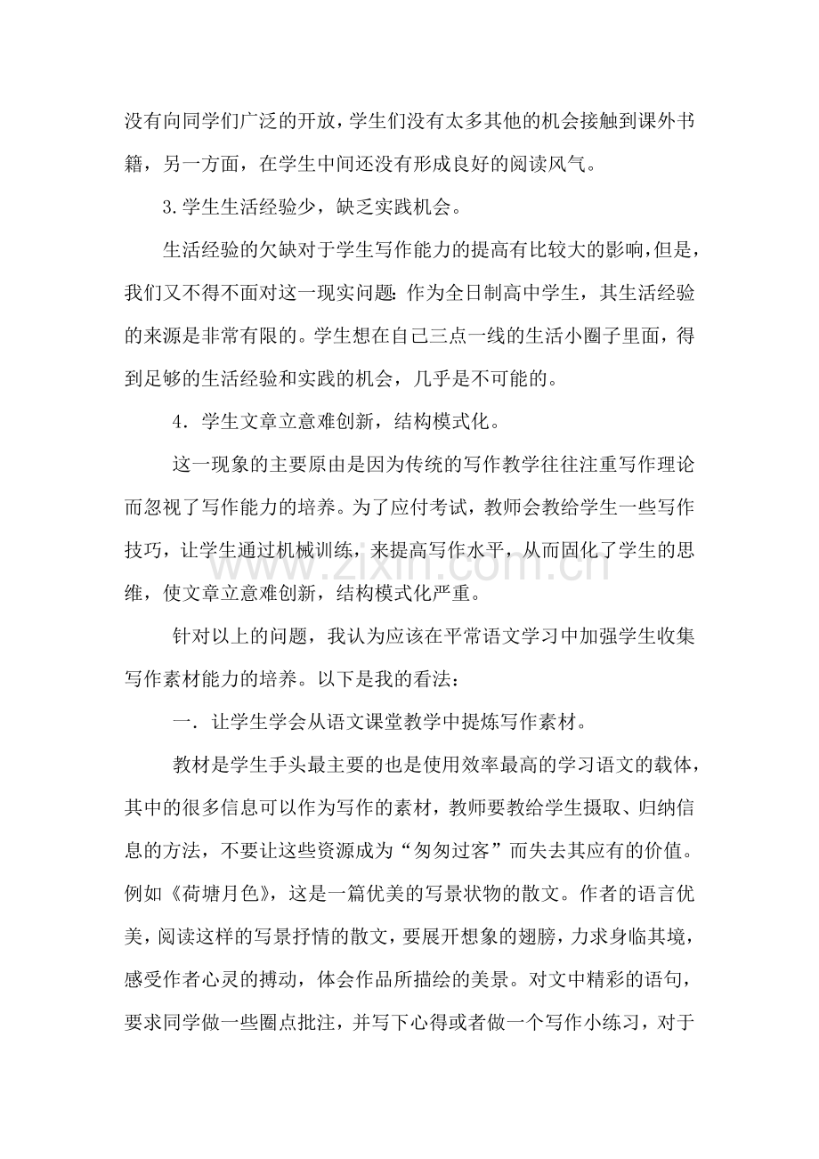 针对以上的问题,我认为应该在平常语文学习中加强学生收集写作素材能力的培养。以下是我的看法: