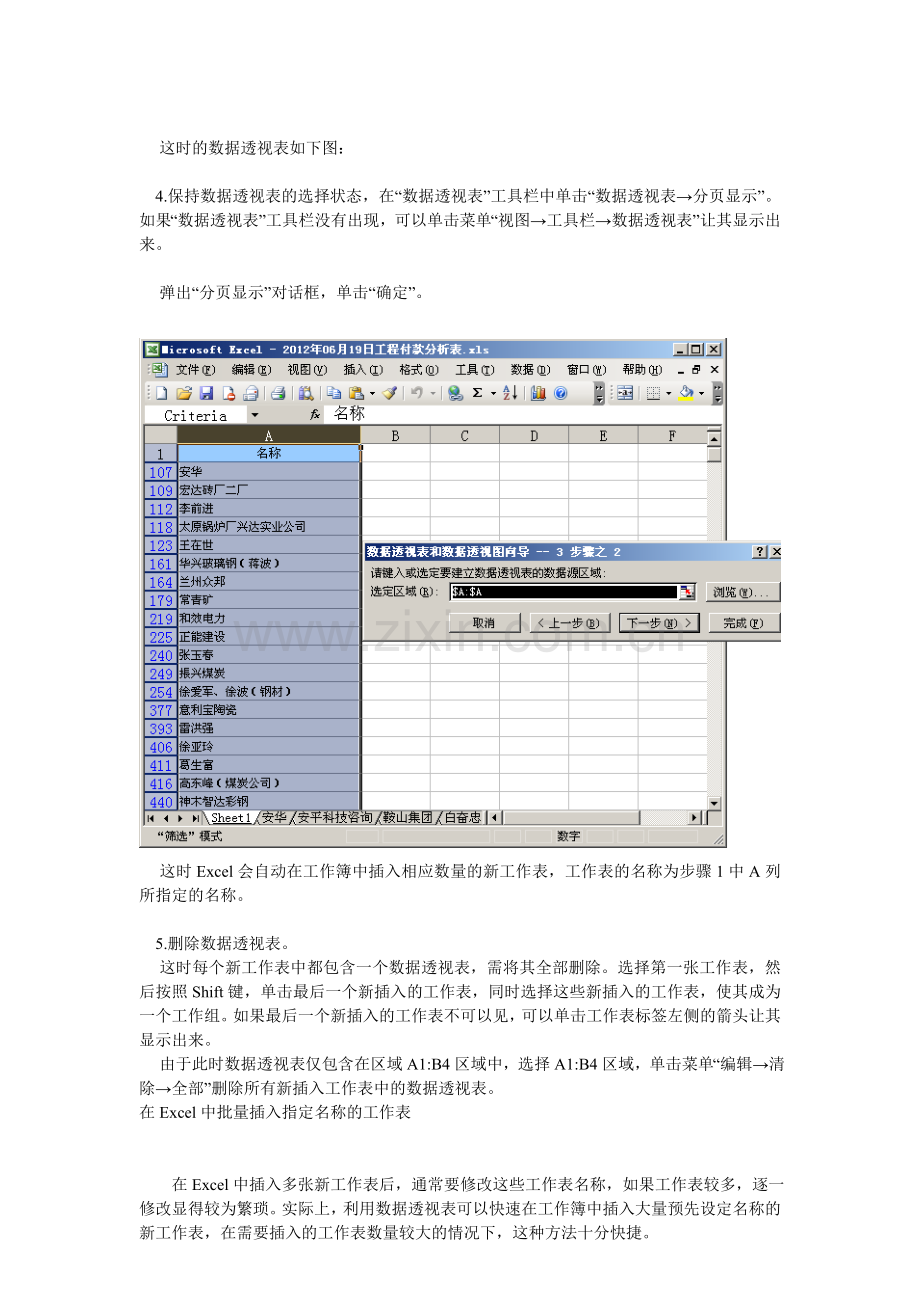 这时每个新工作表中都包含一个数据透视表,需将其全部删除。选择第一张工作表,然后按照Shift键,单击最后一个新插入的工作表,同时选择这些新插入的工作表,使其成为一个工作组。如果最后一个新插入的工作表不可以见,可以单击工作表标签左侧的箭头让其显示出来。