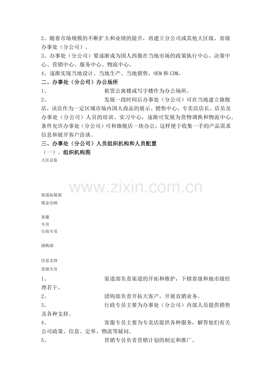 2、随着市场规模的不断扩大和业绩的提升,再建立分公司或其他大区级、省级办事处(分公司)。