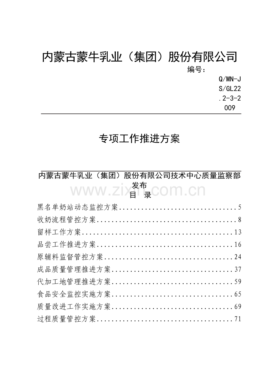 本制度对Q/MN-JS/GL22.2-3-2009《专项工作具体推进方案》的内容进行了修订,其中包括记录的保存期限、黑名单奶站的监控内容、收奶流程的具体内容、品尝中异味样品的要求、留样更改为以奶罐为单位进行、原辅料监控内容进行了修订、成品批检流程重新进行了梳理,并新增子文件《过程质量管控方案》。此文件实施之日起原文件作废。
