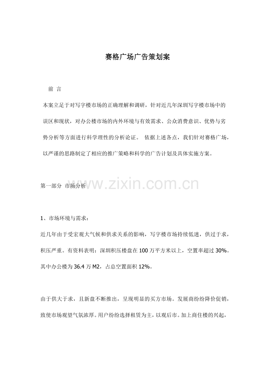 本案立足于对写字楼市场的正确理解和调研,针对近几年深圳写字楼市场中的误区和现状,对办公楼市场的内外环境与有效需求、公众消费意识、优势与劣势分析等方面进行科学理性的分析论证。 依据上述各点,我们针对赛格广场,以严谨的思路制定了相应的推广策略和科学的广告计划及具体实施方案。