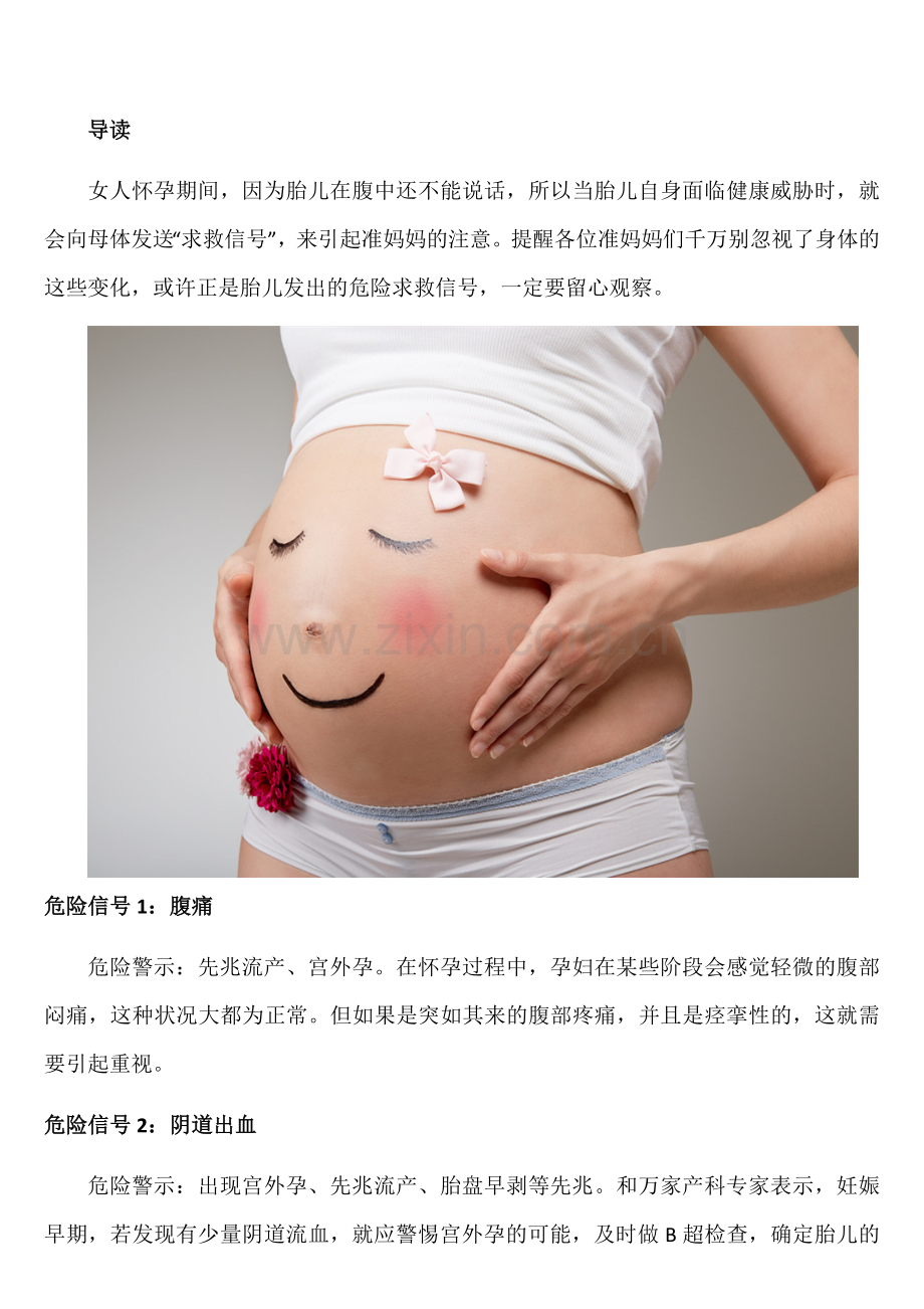 女人怀孕期间,因为胎儿在腹中还不能说话,所以当胎儿自身面临健康威胁时,就会向母体发送“求救信号”,来引起准妈妈的注意。提醒各位准妈妈们千万别忽视了身体的这些变化,或许正是胎儿发出的危险求救信号,一定要留心观察。