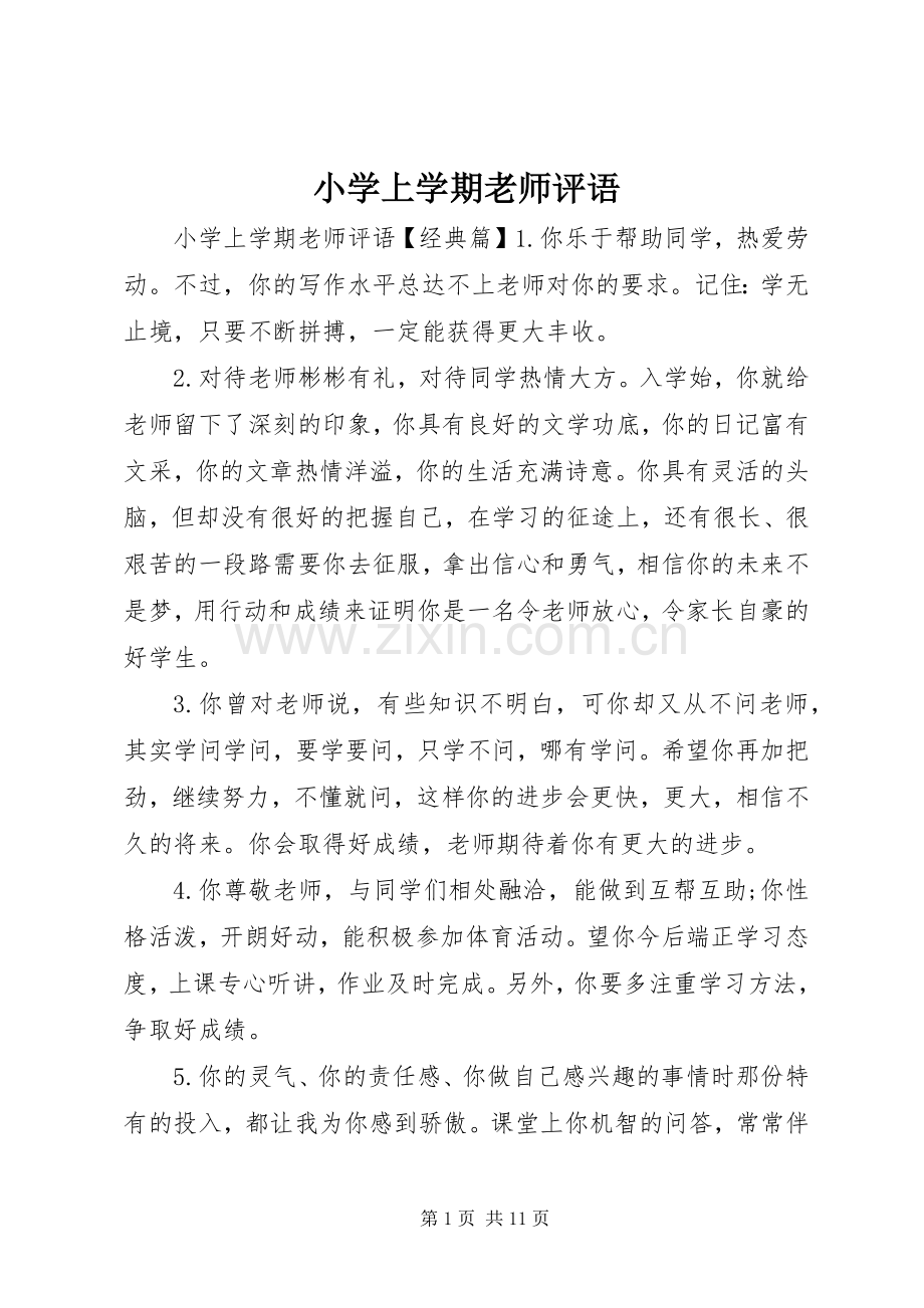 小学上学期老师评语【精选篇】1.谢惠玥。你是位聪明漂亮的孩子,有一颗积极进取的心,热心班级事务,天下无难事,只怕有心人。只要你肯用功,上课专心听讲,认真思考,勇敢举手发言,有错及时改正,不懂就问,相信你会进步得更大,赶快行动吧。加油哦,宝贝。