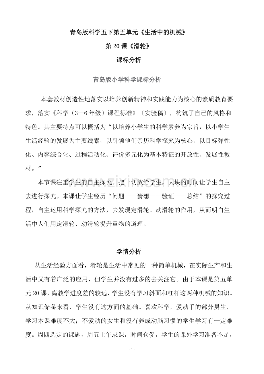本课是青岛版五年级科学下第五单元20课《滑轮》。本单元由《斜面》、《杠杆》、《滑轮》、《齿轮》、《自行车的科学》、《未来的交通工具》等六六课组成,主要研究生活中的简单机械的原理及使用。