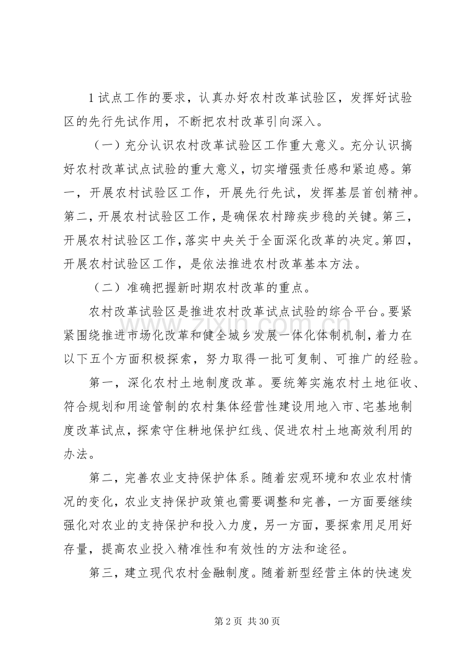 1试点工作的要求,认真办好农村改革试验区,发挥好试验区的先行先试作用,不断把农村改革引向深入。