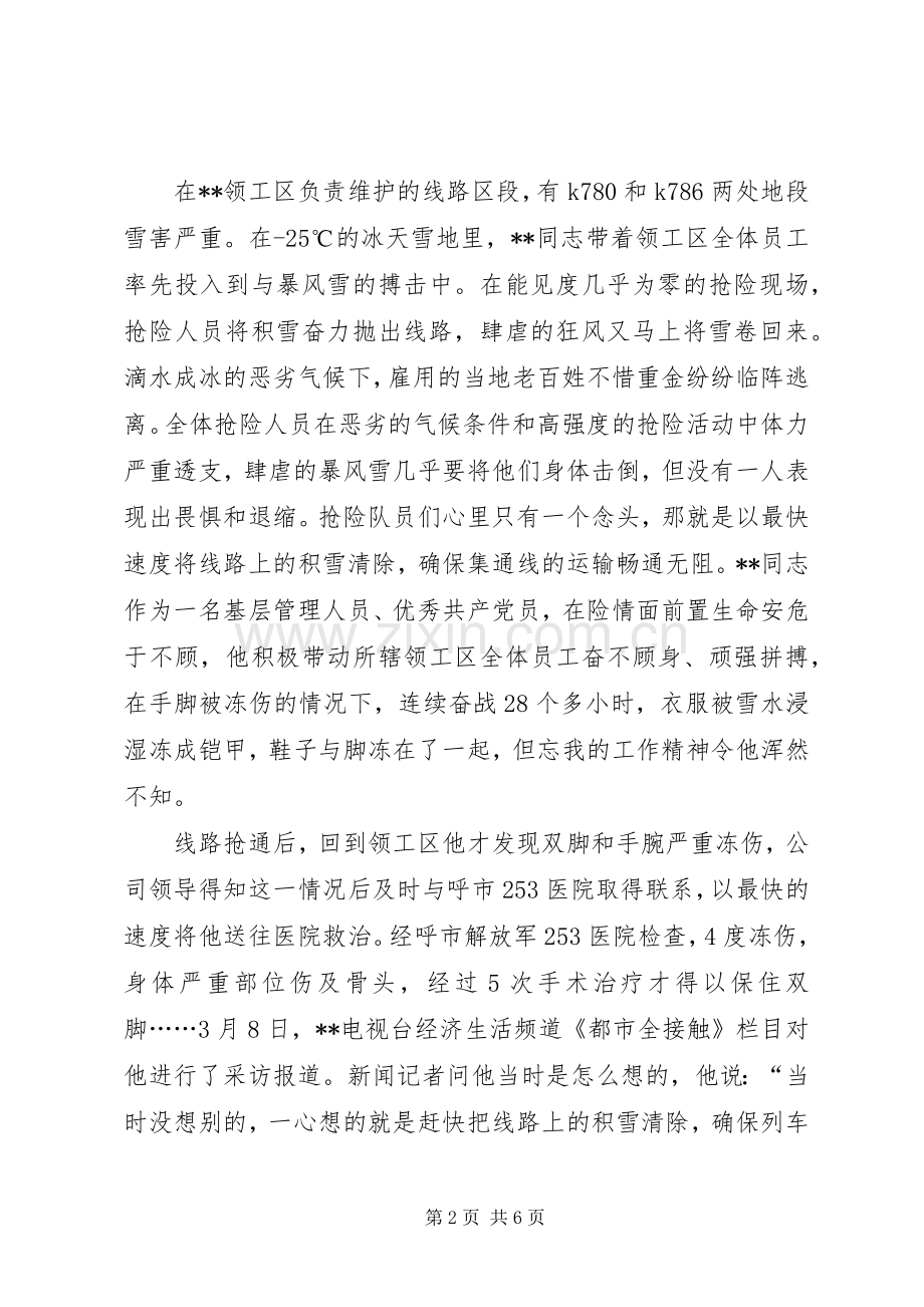 在**领工区负责维护的线路区段,有k780和k786两处地段雪害严重。在-25℃的冰天雪地里,**同志带着领工区全体员工率先投入到与暴风雪的搏击中。在能见度几乎为零的抢险现场,抢险人员将积雪奋力抛出线路,肆虐的狂风又马上将雪卷回来。滴水成冰的恶劣气候下,雇用的当地老百姓不惜重金纷纷临阵逃离。全体抢险人员在恶劣的气候条件和高强度的抢险活动中体力严重透支,肆虐的暴风雪几乎要将他们身体击倒,但没有一人表现出畏惧和退缩。抢险队员们心里只有一个念头,那就是以最快速度将线路上的积雪清除,确保集通线的运输畅通无阻。**同志作为一名基层管理人员、优秀共产党员,在险情面前置生命安危于不顾,他积极带动所辖领工区全体员工奋不顾身、顽强拼搏,在手脚被冻伤的情况下,连续奋战28个多小时,衣服被雪水浸湿冻成铠甲,鞋子与脚冻在了一起,但忘我的工作精神令他浑然不知。