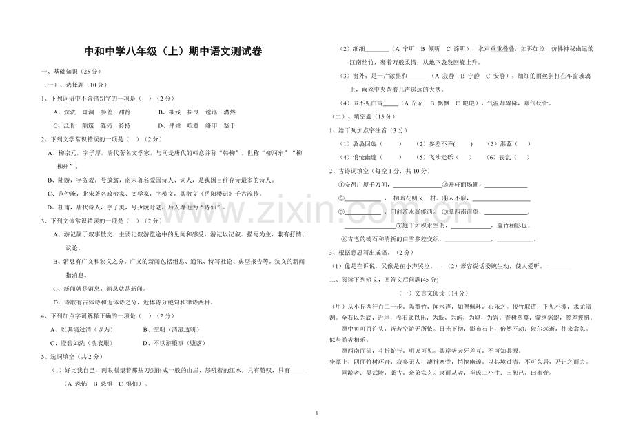 1、柳宗元、唐宋八大家 (2分) 2、D 3、C 4、C (每题2分)