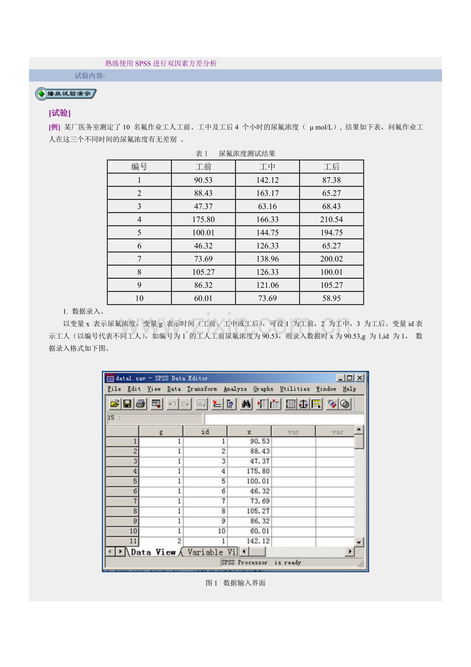 以变量x 表示尿氟浓度,变量g 表示时间(工前、工中或工后),可设1 为工前,2 为工中,3 为工后。变量id表示工人(以编号代表不同工人),如编号为1 的工人工前尿氟浓度为90.53,则录入数据时x为90.53,g 为1,id 为1, 数据录入格式如下图。