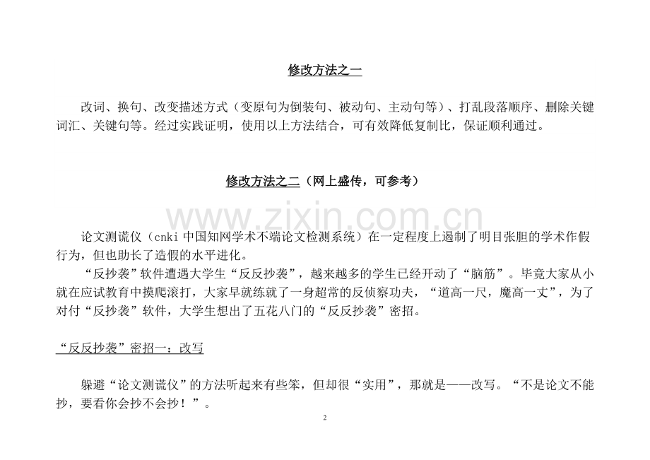 改词、换句、改变描述方式(变原句为倒装句、被动句、主动句等)、打乱段落顺序、删除关键词汇、关键句等。经过实践证明,使用以上方法结合,可有效降低复制比,保证顺利通过。