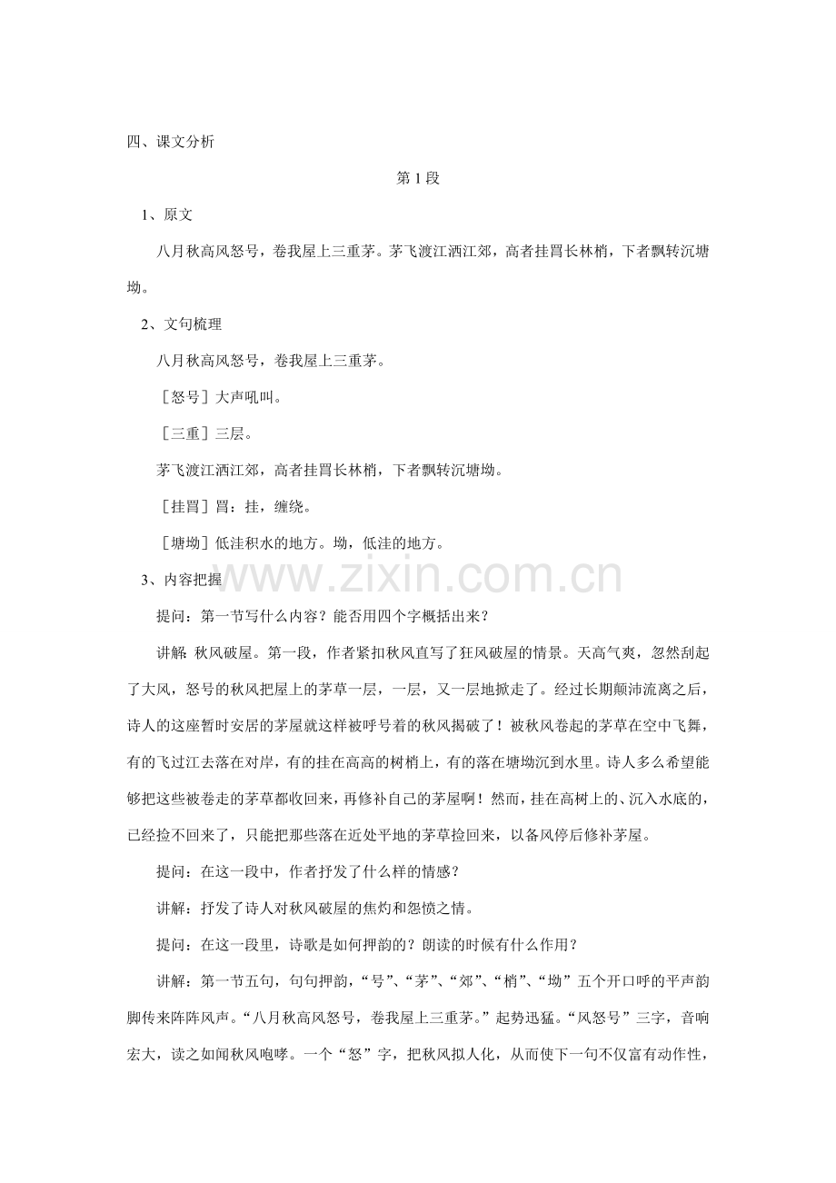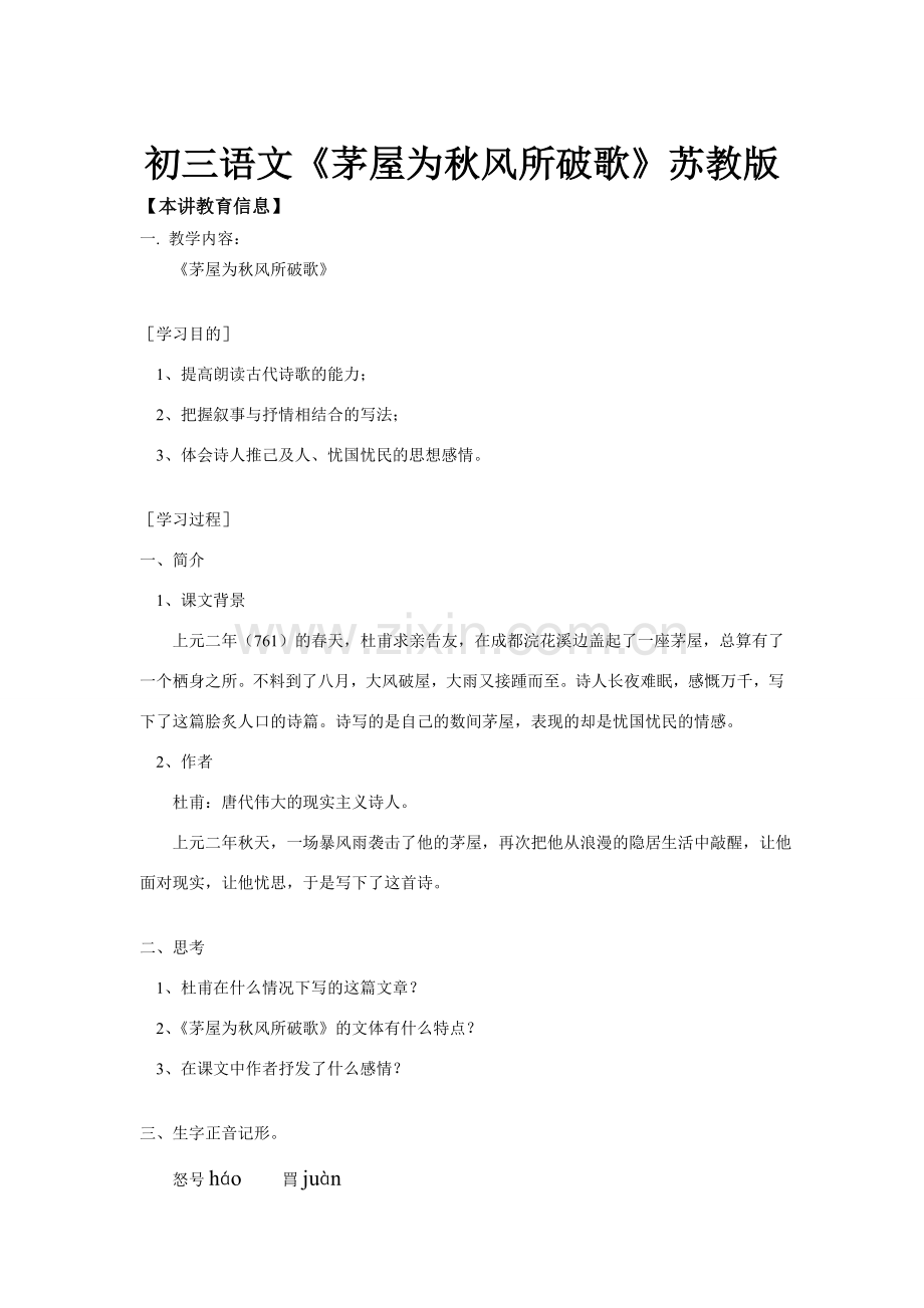 初三语文《茅屋为秋风所破歌》苏教版