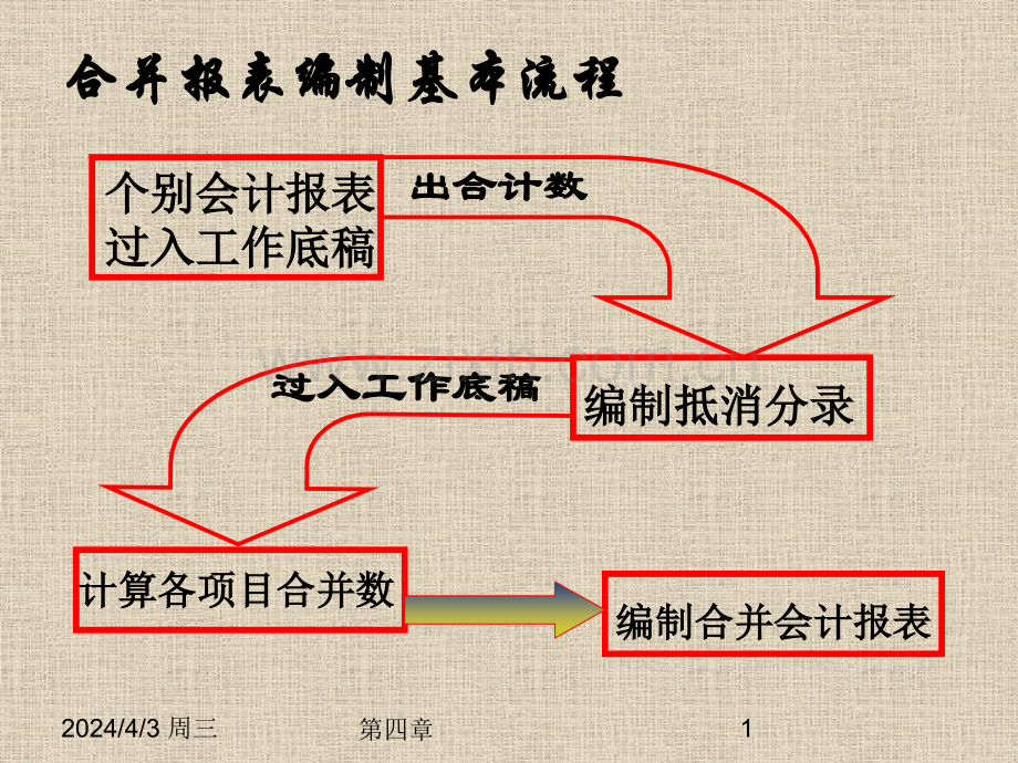 合并报表编制基本流程合并报表编制基本流程2024/4/3 周三第四章1个别会计报表个别会计报表过入工作底稿过入工作底稿 编制抵消分录编制抵消分录 计算各项目合并数计算各项目合并数 编制合并会计报表编制合并会计报表 出合计数出合计数过入工作底稿过入工作底稿第一节第一节 股权取得日后股权取得日后首期合并会计报表的编制首期合并会计报表的编制1 1、按权益法调整、按权益法调整2 2、合并资产负债表、合并利润表、合并资产负债表、合并利润表与合并所有者权益变动表的编制与合并所有者权益变动表的编制 3 3、合并现金流量表的编制、合并现金流量表的编制2024/4/3 周三第四章22024/4/3 周三第四章3具体操作个别报表个别报表合并报表工作底稿工作底稿资产负债表资产负债表 项目抵消项目抵消 利润表利润表项目抵消项目抵消公允价值公允价值 差处理差处理 权益法权益法 调整调整编制交易事交易事项抵消项抵消一、一、按权益法调整对子公司按权益法调整对子公司的长期股权投资的长期股权投资 合并财务报表应以个别财务报表为基础,合并财务报表应以个别财务报表为基础,按照权益法,由母公司编制。按照权益法,由母公司编制。在合并工作底稿中,按权益法调整在合并工作底稿中,按权益法调整对子公司的长期股权投资时,应按照对子公司的长期股权投资时,应按照企企业会计准则第业会计准则第2号号长期股权投资长期股权投资所规所规定的权益法进行调整。定的权益法进行调整。2024/4/3 周三第四章41、成本法与权益法复习 成本法核算要点按照初始投资成本计量按照初始投资成本计量;追加或收回投资应当调整长期股权投资的追加或收回投资应当调整长期股权投资的成本成本;被投资单位宣告分派的现金股利或利润,被投资单位宣告分派的现金股利或利润,确认为当期投资收益确认为当期投资收益;若投资收益,仅限于被投资单位接受投资若投资收益,仅限于被投资单位接受投资后产生的累积净利润的分配额,所获得的后产生的累积净利润的分配额,所获得的利润或现金股利超过上述数额的部分作为利润或现金股利超过上述数额的部分作为初始投资成本的收回。初始投资成本的收回。2024/4/3 周三第四章5权益法的要点投资成本投资成本长期股权投资的初始投资成本大于投资时应享长期股权投资的初始投资成本大于投资时应享有被投资单位可辨认净资产公允价值份额的有被投资单位可辨认净资产公允价值份额的不调整长期股权投资的初始投资成本不调整长期股权投资的初始投资成本长期股权投资的初始投资成本小于投资时应享长期股权投资的初始投资成本小于投资时应享有被投资单位可辨认净资产公允价值份额的有被投资单位可辨认净资产公允价值份额的按其差额,贷记按其差额,贷记“营业外收入营业外收入”科目科目 投资企业按其占被投资企业的投资份额,将投资企业按其占被投资企业的投资份额,将被投资企业所实现的净利润或所发生的净亏损确认被投资企业所实现的净利润或所发生的净亏损确认为投资收益或投资损失。为投资收益或投资损失。2024/4/3 周三第四章62024/4/3 周三第四章7损益调整损益调整 投资企业取得长期股权投资后,应当按照应投资企业取得长期股权投资后,应当按照应享有或应分担的被投资单位实现的净损益的份额,享有或应分担的被投资单位实现的净损益的份额,确认投资损益并调整长期股权投资的账面价值。确认投资损益并调整长期股权投资的账面价值。投资企业按照被投资单位宣告分派的利润或现金投资企业按照被投资单位宣告分派的利润或现金股利计算应分得的部分,相应减少长期股权投资股利计算应分得的部分,相应减少长期股权投资的账面价值。的账面价值。投资企业在确认应享有被投资单位实现的净投资企业在确认应享有被投资单位实现的净损益的份额时,应当以取得投资时被投资单位各损益的份额时,应当以取得投资时被投资单位各项可辨认资产等的公允价值为基础,对被投资单项可辨认资产等的公允价值为基础,对被投资单位的净利润进行调整后确认。位的净利润进行调整后确认。2024/4/3 周三第四章8其他权益变动其他权益变动 投资企业对于被投资单位除净损投资企业对于被投资单位除净损益以外所有者权益的其他变动,应当调整益以外所有者权益的其他变动,应当调整长期股权投资的账面价值并计入所有者权长期股权投资的账面价值并计入所有者权益。益。在持股比例不变的情况下,被投在持股比例不变的情况下,被投资单位除净损益以外所有者权益的其他变资单位除净损益以外所有者权益的其他变动,企业按持股比例计算应享有的份额,动,企业按持股比例计算应享有的份额,借记或贷记借记或贷记“长期股权投资长期股权投资”科目,贷记科目,贷记或借记或借记“资本公积资本公积其他资本公积其他资本公积”科科目。目。2024/4/3 周三第四章9 权益法下投资收益的计算权益法下投资收益的计算投资收益(子公司利润表净利润购买投资收益(子公司利润表净利润购买日子公司可辨认净资产公允价值高于账面日子公司可辨认净资产公允价值高于账面价值本期的摊销额)价值本期的摊销额)母公司持股比例母公司持股比例 少数股东损益的计算少数股东损益的计
