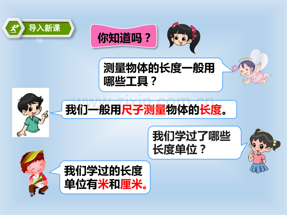 毫米、分米的认识人教版 三年级上教学目标 导入新课导入新课你知道吗?测量物体的长度一般用哪些工具?我们学过的长度单位有米和厘米。我们一般用尺子测量物体的长度。我们学过了哪些长度单位?教学目标 新课讲解新课讲解估一估估一估数学书的长、宽和厚大约是多少厘米。厚大约是数学书的长大约是宽大约是教学目标 新课讲解新课讲解小组合作(3分钟)用尺子量一量数学书的长、宽、高分别是多少厘米。说说你发现了什么问题。教学目标 新课讲解新课讲解你估得准确吗?用尺子量量看!数学书的长是26厘米。量一量教学目标 新课讲解新课讲解你估得准确吗?用尺子量量看!数学书的宽是18厘米多一些,但不够19厘米。量一量教学目标 新课讲解新课讲解你估得准确吗?用尺子量量看!数学书厚不到1厘米。量一量教学目标 新课讲解新课讲解量比较短的物体的长度,或者要求量得比较精确时,可以用毫米作单位。认识毫米毫米(mm)教学目标 新课讲解新课讲解1厘米中间的每一个小格的长度是1毫米。厘米和毫米1mm1厘米是多少毫米?1厘米=10毫米教学目标 新课讲解新课讲解小组合作(3分钟)1.用手比一比1毫米的长度。2.生活中哪些物品的长度大约是1毫米?教学目标 新课讲解新课讲解毫米钟表上时针分针的宽度大约是1毫米。10张纸的厚度大约是1毫米。1分硬币的厚度大约是1毫米。身份证的厚度大约是1毫米。教学目标 新课讲解新课讲解做一做1.填一填。2842你会填吗?()厘米()毫米()厘米()毫米教学目标 新课讲解新课讲解数一数2.写出下面长度是多少毫米。()毫米()毫米2734你会量吗?教学目标 新课讲解新课讲解量一量3.量一量。()毫米()毫米923()毫米39你会量吗?教学目标 新课讲解新课讲解分米量物体的长度有时也用分米(dm)做单位。在直尺上找出10厘米。1分米1分米=10厘米教学目标 新课讲解新课讲解我是这样比的。分米我是这样比的。你能用手势表示出1分米的长度吗?教学目标 新课讲解新课讲解在米尺上数一数,可以知道:1米=10分米。米和分米因为1米=100厘米,1分米=10厘米,100里面有10个10厘米,所以1米=10分米。想一想,1米等于多少分米?1米=10分米教学目标 新课讲解新课讲解做一做2厘米=()毫米2080厘米=()分米810厘米是1分米,80厘米里面有8个10厘米,是8分米。2厘米1厘米是10毫米,2厘米是2个10毫米,是20毫米。80厘米教学目标 新课讲解新课讲解做一做7分米=()厘米5米=()分米60毫米=()厘米705061米是10分米,5米就是5个10分米。1分米是10厘米,7分米就是7个10厘米。10毫米是1厘米,60毫米里面有6个10毫米。教学目标 新课讲解新课讲解做一做一根木头长1米,截去一部分后,现在长2分米,这根木头截去了多长?10-2=8(分米)1米=10分米用木头原来的长度减去现在的长度,就是截去的长度。答:这根木头截去了8分米。教学目标 新课讲解新课讲解毫米和分米的认识:1.测量较短的物体的长度或要求量得比较精确时,可以用毫米(mm)作单位。2.测量物体的长度有时也可以用分米(dm)作单位。3.1厘米=10毫米。1分米=10厘米。1米=10分米。教学目标 巩固提升巩固提升做一做。日记本的长是2(),宽14()。填上合适的长度单位。长宽一粒大米宽2()。分米厘米毫米分米一根黄瓜长2()。教学目标 巩固提升巩固提升填一填。40厘米=()分米5分米=()厘米7厘米=()毫米50704330毫米=()厘米37厘米-17厘米=()厘米=()分米9厘米+31厘米=()厘米=()分米45毫米+55毫米=()毫米=()厘米20210010404教学目标 巩固提升巩固提升做一做。我会判。(1)一支新铅笔的长度大约是2米。()(2)10分米=1米 ()(3)一张床长2分米。()(4)一本数学书厚大约是6毫米。()教学目标 巩固提升巩固提升做一做。用一根长2米的木料,锯成同样长的4根,用来做凳腿,这个凳子的高大约是多少?2米=20分米204=5(分米)答:这个凳子的高大约是5分米。教学目标 巩固提升巩固提升做一做。小组合作(3分钟)一根丝带长50分米,捆一个大礼品盒用去了12分米,剩下的丝带每7分米能捆一个小礼品盒。剩下的丝带还可以捆几个小礼品盒?教学目标 巩固提升巩固提升做一做。一根丝带长50分米,捆一个大礼品盒用去了12分米,剩下的丝带每70厘米能捆一个小礼品盒。剩下的丝带还可以捆几个小礼品盒?先求剩下的丝带长多少分米。50-12=38(分米)再求剩下的丝带可以捆几个小礼品盒。3875(个)答:剩下的丝带还可以捆5个小礼品盒。70厘米=7分米教学目标 课堂小结课堂小结通过学习,你有什么收获?通过学习,你有什么收获?0102031.测量较短的物体的长度或要求量得比较精确时,可以用毫米(mm)作单位。2.测量物体的长度有时也可以用分米(dm)作单位。3.1厘米=10毫米。1分米=10厘米。1米=10分米教学目标 课堂小结课堂小结完成教材24页1、2、3、4题。