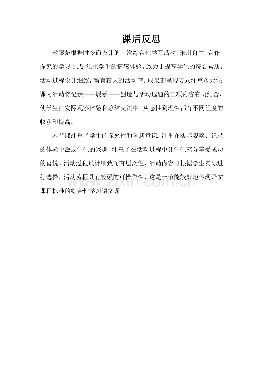 教案是根据时令而设计的一次综合性学习活动。采用自主、合作、探究的学习方式;注重学生的情感体验。致力于提高学生的综合素质。活动过程设计细致,留有较大的活动空。成果的呈现方式注重多元化;课内活动将记录──展示──创造与活动选题的三项内容有机结合,使学生在实际观察体验和总结交流中,从感性到理性都有不同程度的收获和提高。