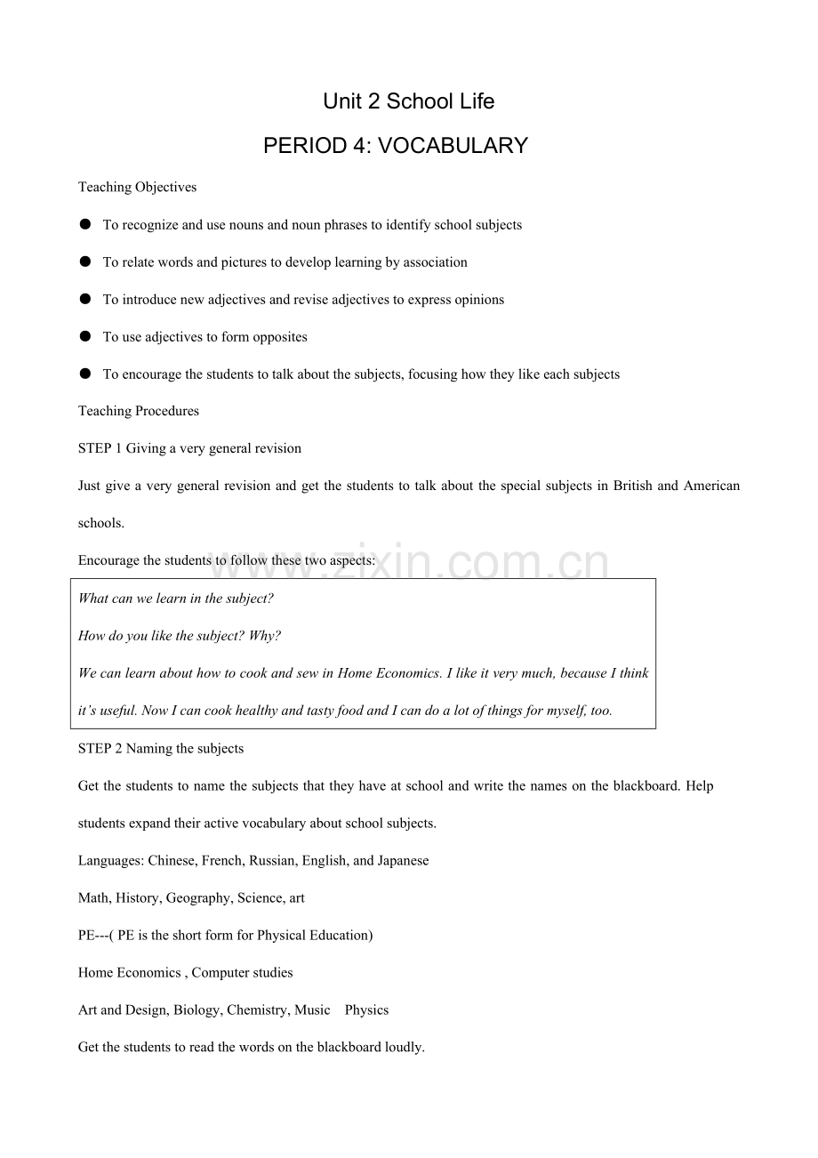Get the students to name the subjects that they have at school and write the names on the blackboard. Help students expand their active vocabulary about school subjects.