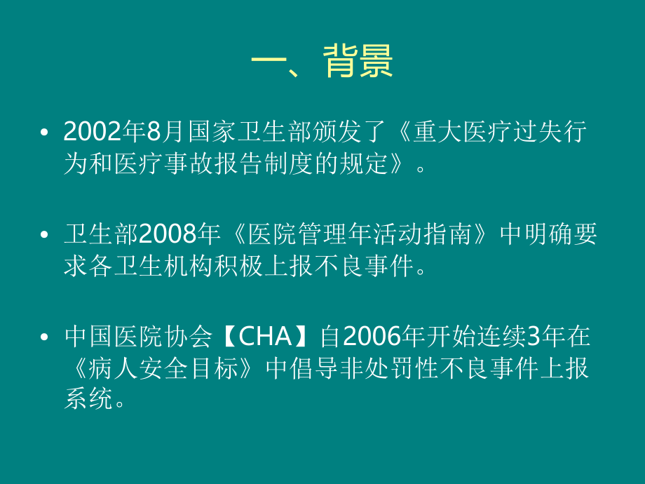 单击此处编辑母版标题样式,单击此处编辑母版文本样式,第二级,第三级,第四级,第五级,*,护理不良事件与护理缺陷,马永会,2015-1-10,一、背景,2002年8月国家卫生部颁发了重大医疗过失行为和医疗事故报告制度的规定。,卫生部2008年医院管理年活动指南中明确要求各卫生机构积极上报不良事件。,中国医院协会【CHA】自2006年开始连续3年在病人安全目标中倡导非处罚性不良事件上报系统。,国内外现状,美国、澳大利亚、日本等多国已建立了不良事件报告内部系统和外部系统。,美国安全用药研究会和美国药典委员会的用药差错报告,。,患者安全,世界性重要议题,医疗差错、事故发生率,1999,年美国相关调查表明,其他人员(其中,30%-50%,事故中,有,2%,由护士引起)。,给药错误(包括剂量错误、途径错误),病人跌倒坠床,发生压疮,管道脱出,服务态度不好引发纠纷等,操作失误,发生,护理差错,的类别,卫生部,2007,年对全国,696,所医院的调查,患者安全,世界性重要议题,二、护理缺陷,定义,在护理活动中因违反医疗卫生法律、法规和护理规章与规范等,造成护理技术、服务、管理等方面的失误。护理缺陷包括护理事故及差错。,护理缺陷分类,护理事故,:护理事故是指在护理过程中,由于护理人员的过失,直接造成患者死亡、残废、组织器官损害导致功能障碍。,护理差错:,护理差错是指在护理过程中,因责任心不强、工作粗疏、不严格执行规章制度或违反操作规程的原因,给患者造成精神及肉体上的痛苦,但未造成严重后果。,护理缺点,:在临床工作中,虽然有某一环节的错误,但被发现后得到及时纠正,未发生在病人身上(如错医嘱,但未执行)的现象,称为护理缺点。,护理纠纷:,是指基于护理行为,在医方(医疗机构)与患方(患者或者患者近亲属)之间产生的护理过错、过失、侵权等赔偿纠纷。,护理事故,定义,是指在诊疗护理工作中,因医务人员诊疗护理过失,直接造成病员死亡、残疾、组织器官损伤,导致功能障碍的严重质量缺陷。,事故等级分类,一级事故:,造成患者死亡、重度残疾者。,二级事故:,造成患者中度残疾、器官组织损伤导致严重功能障碍者。,三级事故:,造成患者轻度残疾、器官组织损伤导致一般功能障碍者。,四级事故:,造成患者明显人身损害的其他后果的。,事故评定标准,1,、护理人员工作不负责任。交接班不认真、观察病情不细致、病情变化发现不及时,以致失去抢救机会,造成严重不良后果者。,2,、不认真执行查对制度导致打错针、发错药、输错血液;护理不周到发生严重烫伤或,度褥疮、昏迷躁动病人或无陪伴的小儿坠床,造成严重不良后果者。,事故评定标准,3,、对疑难问题不请示汇报、主观臆断,擅自盲目处理,造成严重不良后果者。,4,、延误供应抢救物资药品,供应过期的或未灭菌的器械敷料药品、或因无菌操作不严而发生感染,造成严重不良后果者。,5,、不掌握医疗原则,滥用麻醉药品,造成严重不良后果者。,6,、手术室,护士,点错纱布、器械,因而遗留在体腔或伤口内,造成严重不良后果者。,护理差错,严重差错:,在护理工作中,由于责任心不强,查对不严,违反操作规程或技术水平低等原因所造成的错误,给病人造成痛苦,延长治疗时间,增加经济负担,但未造成死亡,残废和组织器官损伤导致功能障碍的,为,类差错,.,一般护理差错,:由于护理人员在工作中由于责任或技术原因发生的错误,未对病人造成影响,或对病人有轻度影响但未造成不良后果者,或错误性质虽严重但未造成病人发生任何不良反应者。,严重差错评定标准,1,)对危重病人观察不仔细,发现问题不及时通知医师,贻误治疗。,2,)应用特殊药物如:洋地黄,麻醉药,胰岛素,氯化钾等药物时,因注射方法或剂量不正确而发生反应者。,3,)输血不能按规程操作造成浪费者。,4,)查对不严导致输入有霉菌(肉眼所见)的液体、异型血、错注青霉素或未做皮试注射青霉素,未发生严重后果者,5,)昏迷、重危病人、兴奋躁动、小儿因管理不严或不符合正常约束要求等原因所致坠床,造成软组织挫伤,经治疗而无功能障碍者。,6,)责任心不强将各种穿刺、活检、特殊化验等重要标本取错、损坏或遗失,而贻误诊断增加病人痛苦和经济负担,但未引起严重后果者。,严重差错评定标准,7,)危重病人,(,休克、昏迷、五衰等,),未作床头交班者,发生异常未及时发现,延误抢救时机者;对感染性和出血性等疾病不按时测脉搏血压和观察生命体征,出现休克发现不及时者。,8,)延误或漏用抢救药品或治疗药品如:抗菌素、脱水剂、强心剂、利尿剂、镇静剂、呼吸兴奋剂、各种血管活性药物、胆硷脂酶复活剂等,临时医嘱超过,30,分钟、长期医嘱超过,24,小时还未使用;各种血管活性药剂量超过一倍;使用上述药物后未注明用药时间及剂量。,9,)对患者有心功能不全、严重脱水、各型休克、肺炎等病人不按医嘱要求进行静脉推注药物和补充液体,影响疗效或引起明显付作用;静脉输液中液体渗入皮下,造成局部组织感染坏死,经治愈者。,10,)护理工作中因护理不当未尽到责任造成,度褥疮、热疗或保暖造成的灼伤,占体表面积,0.25%,、深度或浅,度类以上,短期治疗难以治愈者。,严重差错评定标准,11,)接产工作中由于病情复杂或有严重合并症,以致子宫破裂,经及时治疗而无严重不良后果者。,12,)不消毒分娩(特殊情况例外)、产后会阴,度裂伤以下(急产
