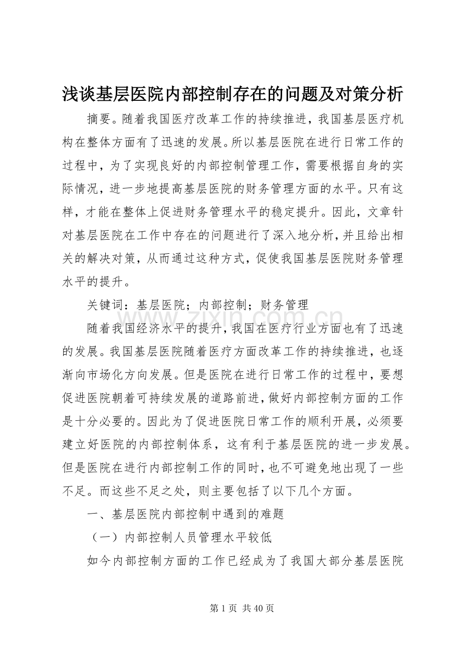 摘要。随着我国医疗改革工作的持续推进,我国基层医疗机构在整体方面有了迅速的发展。所以基层医院在进行日常工作的过程中,为了实现良好的内部控制管理工作,需要根据自身的实际情况,进一步地提高基层医院的财务管理方面的水平。只有这样,才能在整体上促进财务管理水平的稳定提升。因此,文章针对基层医院在工作中存在的问题进行了深入地分析,并且给出相关的解决对策,从而通过这种方式,促使我国基层医院财务管理水平的提升。