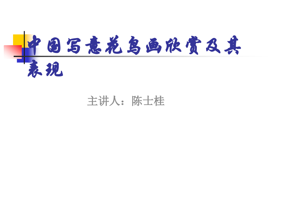 Click to edit Master title style,Click to edit Master text styles,Second level,Third level,Fourth level,Fifth level,11/7/2009,#,单击此处编辑母版标题样式,单击此处编辑母版文本样式,第二级,第三级,第四级,第五级,1,*,中国写意花鸟画欣赏及其表现,主讲人:陈士桂,中国写意花鸟画欣赏及其表现,美术的概念、作用,什么叫中国画,中国画的特点,花鸟画的类别,花鸟画欣赏,欣赏的差异性,欣赏的前题条件,欣赏花鸟画的客观标准,构图美,笔墨美,意境美,题款与印章,陈士桂作品赏析,谢谢大家!,美术的概念、作用,绘画,雕塑,工艺美术,建筑,美,术,东方绘画(中国画为主流,含山水、人物花鸟等),西方绘画(素描、油画、水粉等),圆雕(形象完全立体),浮雕(形象半立体),欣赏性美术,满足精神生活。,传统手工艺(漆器、玉器、景泰蓝等),商业美术(广告、橱窗、标志设计等),工业美术(花布、陶瓷、交通工具等),公用建筑(会堂、剧场、学校等),民用建筑(居民楼、四合院等),实用美术,满足物质生活。,什么叫中国画,中国画,简称国画,一般是指用毛笔在宣纸或是丝绢上用墨色和中国画颜料所画的水墨画、彩墨画、工笔淡彩画、工笔重彩画和白描,自成体系(在绘画中唯一以国家名称命名的画科)。,中国画在题材上分人物、山水、花鸟三大科目。在技法上分工笔、写意、半工半写。,中国画的特点,在描绘物象上,主要运用线条和墨色来表现,具有高度的概括力和表现力。在绘画中运用书法与篆刻功底入画,以达到,“,气韵生动,”、“,形神兼备,”,的效果。,要求诗、书、画、印融为一体,才能成为一幅完整的作品。,讲究,“,骨法用笔,”、“,书法入画,”,,画出的线条要有力度和节奏。,“,以白记黑,”,,利用空白让人产生联想,讲究,“,意境,”,,画面的前后层次是用笔墨浓淡来显示的。,不讲究焦点透视,以散点透视把不同的时间、空间表现在同一画面上。,以少胜多,花鸟画以折枝法构图。,花鸟画的类别,从技法上分:,工笔,:工笔淡彩、工笔重彩、白描,写意,:小写意、大写意,半工半写:,从题目材上分:山水、人物以外,都属花鸟画范畴,主要有:花卉、禽鸟、草虫、蔬果、走兽、鳞介,树石等。,从表现形式上分:主要有,中堂,、,立轴,、,条屏,、册页、,扇面,、长卷、,横幅,、,斗方,。,工笔,写意,中堂,立轴,条屏,扇面,横幅,斗方,花鸟画欣赏,欣赏花鸟画作品和创作一样,是复杂而特殊的精神活动,它具有不同的目的性,存在着极大的个性差异。,欣赏的差异性,欣赏者的职业、性别、年龄、身份、知识素养、民族等方面的差异。概括起来,花鸟画的欣赏具有时间性、地域性、阶层性、民族性等几个特点。,时间性,:,不同年代,不同时间会产生不同的欣赏效果。,地域性,:,如中国绘画和外国绘画,我国的南方和北方,东部地区和西部地区。,阶层性,:,指同一民族在同一文化大前景下进行美术欣赏时,因所处地位,从事工作不同而呈现欣赏效果不同。,民族性,:,各民族有一个相对稳定居住地,有着自己的生活习惯、文化信仰和道德行为准则,再加上气候等自然环境不同,呈现出不同的欣赏观。,欣赏的前题条件,基本的文化素养:对于一个目不识丁的人再动人的小说也只是一堆废纸。美术家在创作优秀作品的同时,还要求观众以必备的文化素养与之相适应。具有一定的水准才能领会理解作者的意图,从而产生交流与共鸣。,专业美术素养:美术是一种视觉艺术,是一种特殊语言构成和表达方式,了解基本的美术知识是进行花鸟画欣赏的必要条件。,专业素养包括:美术基本历史,基本造型方法、审美习惯等。,欣赏的前题条件,外部条件:社会安定,经济发展,人民富裕等。没有高度的经济条件,物质条件,美术创作和欣赏只能是一句空话。,鲁迅说:灾区的饥民大约不会去种兰花。,欣赏花鸟画的客观标准,构图美,构图的主要要素,:,主次,呼应,虚实,开合,聚散,疏密,画面的构图形式有:,A,形,、,S,形,、,U,形,、,C,形,、,上挺式,、,下垂式,等。,形构图,A,形构图,S,形构图,U,形构图,C,上挺式构图,下垂式构图,笔墨美,用墨:,墨分五彩,:,焦、浓、重、淡、清。,浓、淡、干、湿,积墨、泼墨、破墨,线造型:点、线、面、皴、擦等。,用笔:,中锋、侧锋、顺锋、逆锋、散锋,力透纸背、屋漏痕、春蚕吐丝、锥划沙,意境美,外师造化,中得心源,写实,写心,花鸟画创作要师法自然,还要有美的冲动,才能激起强烈的造型欲。,美的冲动来源于对自然美的观察,在美的欣赏得到满足后,便,“,欲夺其造化,”,而进行创作。要用心来画,即意境。,题款与印章,诗书画印融为一体是中国画的独特之处。,题款作用:,题意,:抒发感情、阐述和发挥画意,增加画面形式美感,诗文、书法美感。,证明作者姓名、时间、地点等。,平衡、补白、连接,印章作用:万绿丛中一点红,平衡,、,补白,、,连接,题款与印章,题意,题意,连接,补白,平衡,平衡,补白、题意,陈士桂作品赏析,骨法用笔,书法入画,
