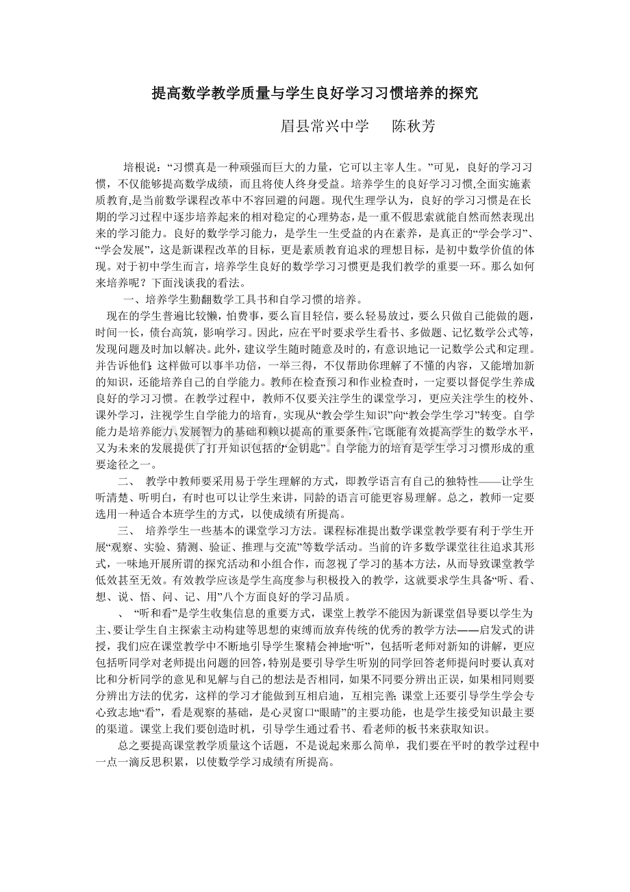 培根说:“习惯真是一种顽强而巨大的力量,它可以主宰人生。”可见,良好的学习习惯,不仅能够提高数学成绩,而且将使人终身受益。培养学生的良好学习习惯,全面实施素质教育,是当前数学课程改革中不容回避的问题。现代生理学认为,良好的学习习惯是在长期的学习过程中逐步培养起来的相对稳定的心理势态,是一重不假思索就能自然而然表现出来的学习能力。良好的数学学习能力,是学生一生受益的内在素养,是真正的“学会学习”、“学会发展”,这是新课程改革的目标,更是素质教育追求的理想目标,是初中数学价值的体现。对于初中学生而言,培养学生良好的数学学习习惯更是我们教学的重要一环。那么如何来培养呢?下面浅谈我的看法。