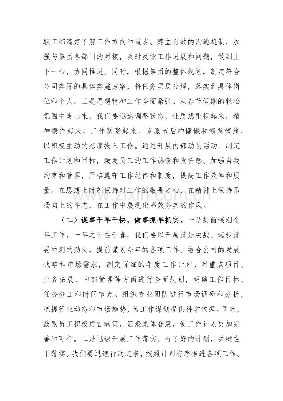 (二)谋事干早干快,做事抓早抓实。一是提前谋划全年工作。一年之计在于春,我们要以开局就是决战、起步就要冲刺的劲头,提前谋划今年的各项工作。结合公司的发展战略和市场需求,制定详细的年度工作计划。对重点项目、业务拓展、内部管理等方面进行全面规划,明确工作目标、任务分工和时间节点。组织专业团队进行市场调研和分析,把握行业动态和市场趋势,为工作谋划提供科学依据。同时,鼓励员工积极建言献策,汇聚集体智慧,使工作计划更加完善和可行。二是迅速开展工作落实。有了好的计划,关键在于落实。我们要迅速行动起来,按照计划有序推进各项工作。对于已经确定的任务,要立即安排人员,调配资源,确保工作顺利开展。建立工作进度跟踪机制,定期检查工作进展情况,及时解决工作中出现的问题。加强工作协调和沟通,打破部门之间的壁垒,形成工作合力。对于重要项目和任务,要成立专门的工作小组,加强领导和监督,确保按时完成。三是建立工作监督机制。为了确保谋事干早干快、做事抓早抓实,我们要建立健全工作监督机制。明确监督职责和权限,对工作的各个环节进行监督检查。制定科学合理的考核指标和评价标准,对工作完成情况进行量化考核。加强对工作过程的监督,及时发现和纠正工作中的偏差和失误。对于工作表现优秀的部门和个人,要给予表彰和奖励;对于工作不力、拖延推诿的,要进行严肃批评和问责。通过监督机制,激励员工积极工作,提高工作执行力。
