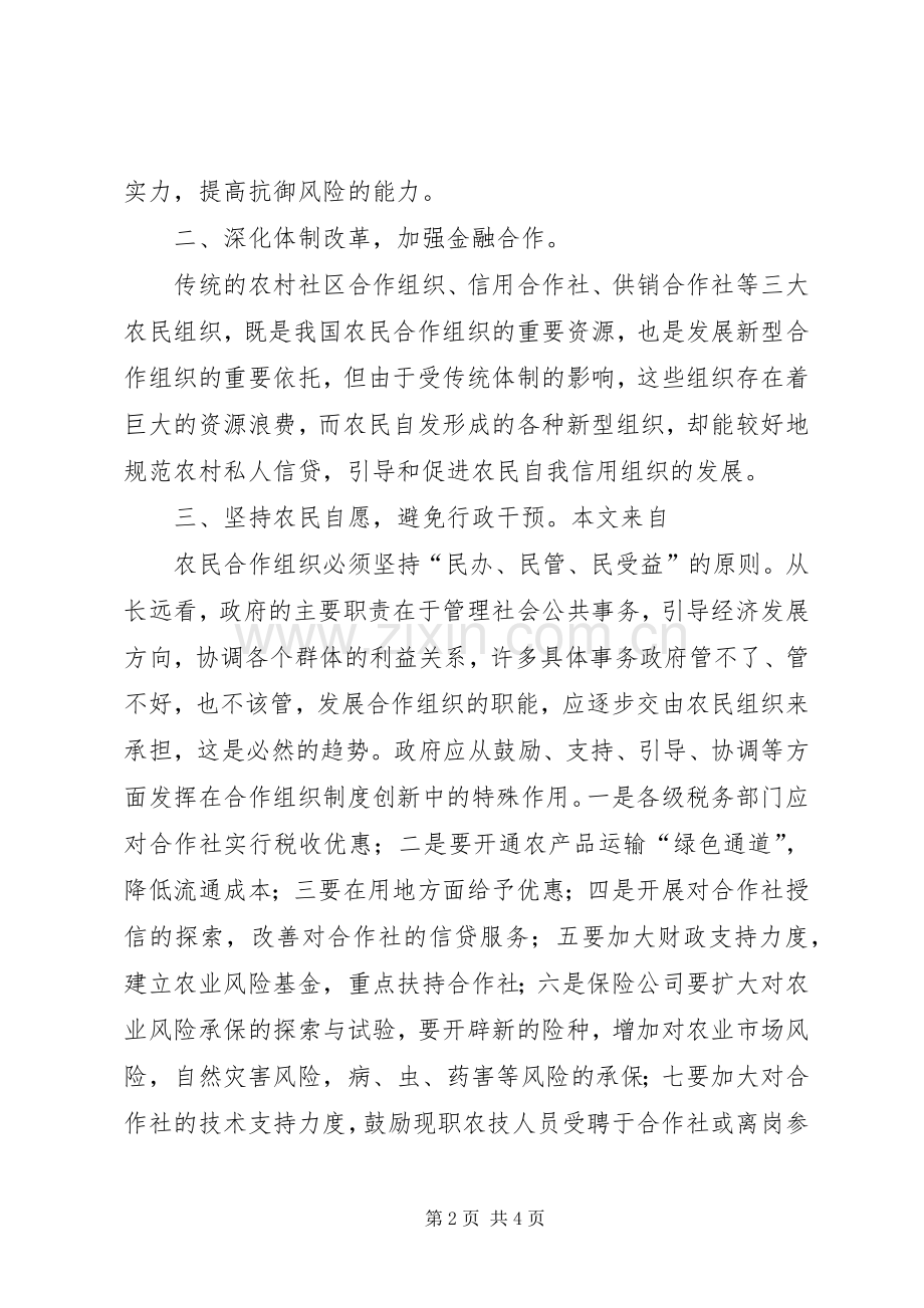 从总体上看,目前的农村合作组织大多是外部力量干预和渗透的结果,由于和农民的根本利益不一致,导致合作组织发展的迟缓、短暂,甚至使农民的利益受到损害。要想从根本上解决农民经济发展的问题,保护农民的权益,提高农民的收入,就必须建立起真正属于农民自己的合作组织。只有这种真正意义上的、自发的农民合作组织,才能构成农村经济发展的组织依托。