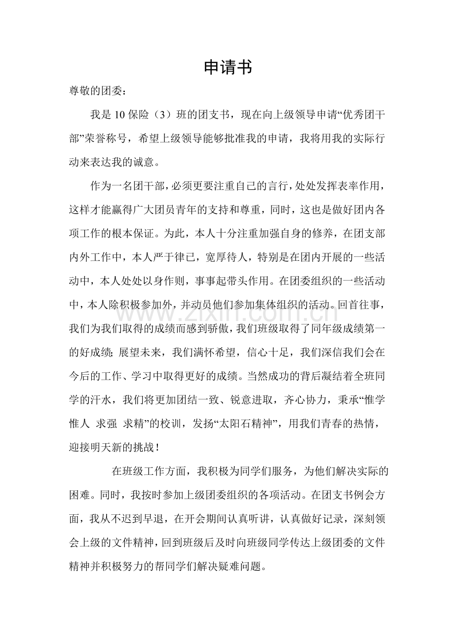 我是10保险(3)班的团支书,现在向上级领导申请“优秀团干部”荣誉称号,希望上级领导能够批准我的申请,我将用我的实际行动来表达我的诚意。