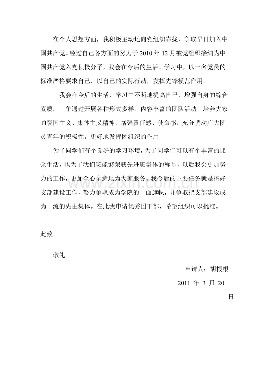 为了同学们有个良好的学习环境,为了同学们可以有个丰富的课余生活,也为了我们班能够荣获先进班集体的称号,以后我会更加努力的工作,更加全心全意地为大家服务。我今后的主要任务就是搞好支部建设工作,努力争取成为学院的一面旗帜,并争取把支部建设成为一流的先进集体。在此我申请优秀团干部,希望组织可以批准。