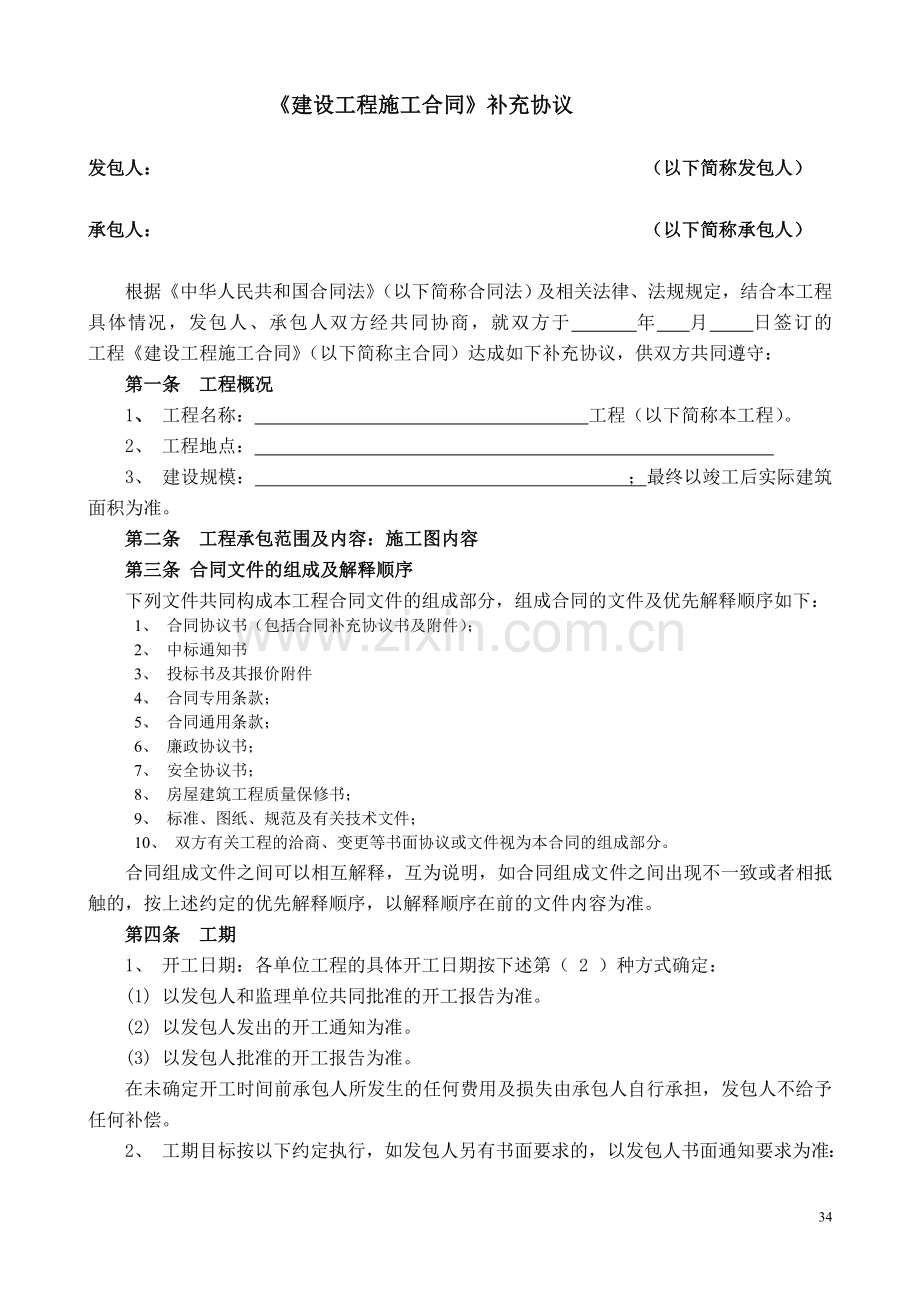 根据《中华人民共和国合同法》(以下简称合同法)及相关法律、法规规定,结合本工程具体情况,发包人、承包人双方经共同协商,就双方于 年 月 日签订的 工程《建设工程施工合同》(以下简称主合同)达成如下补充协议,供双方共同遵守:
